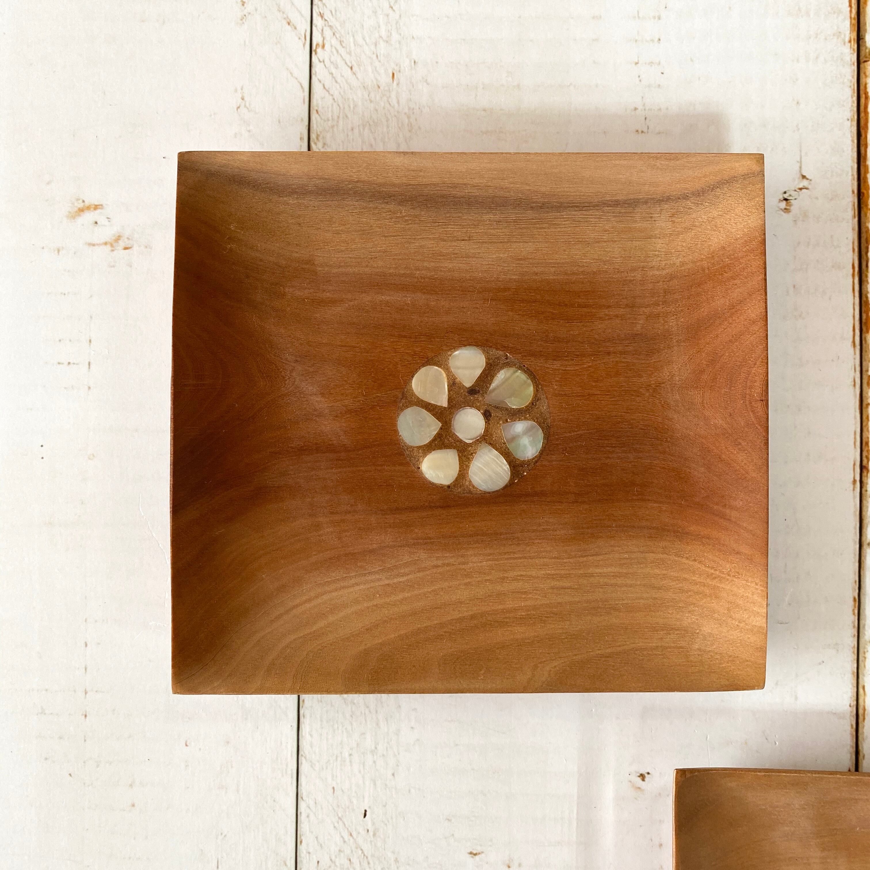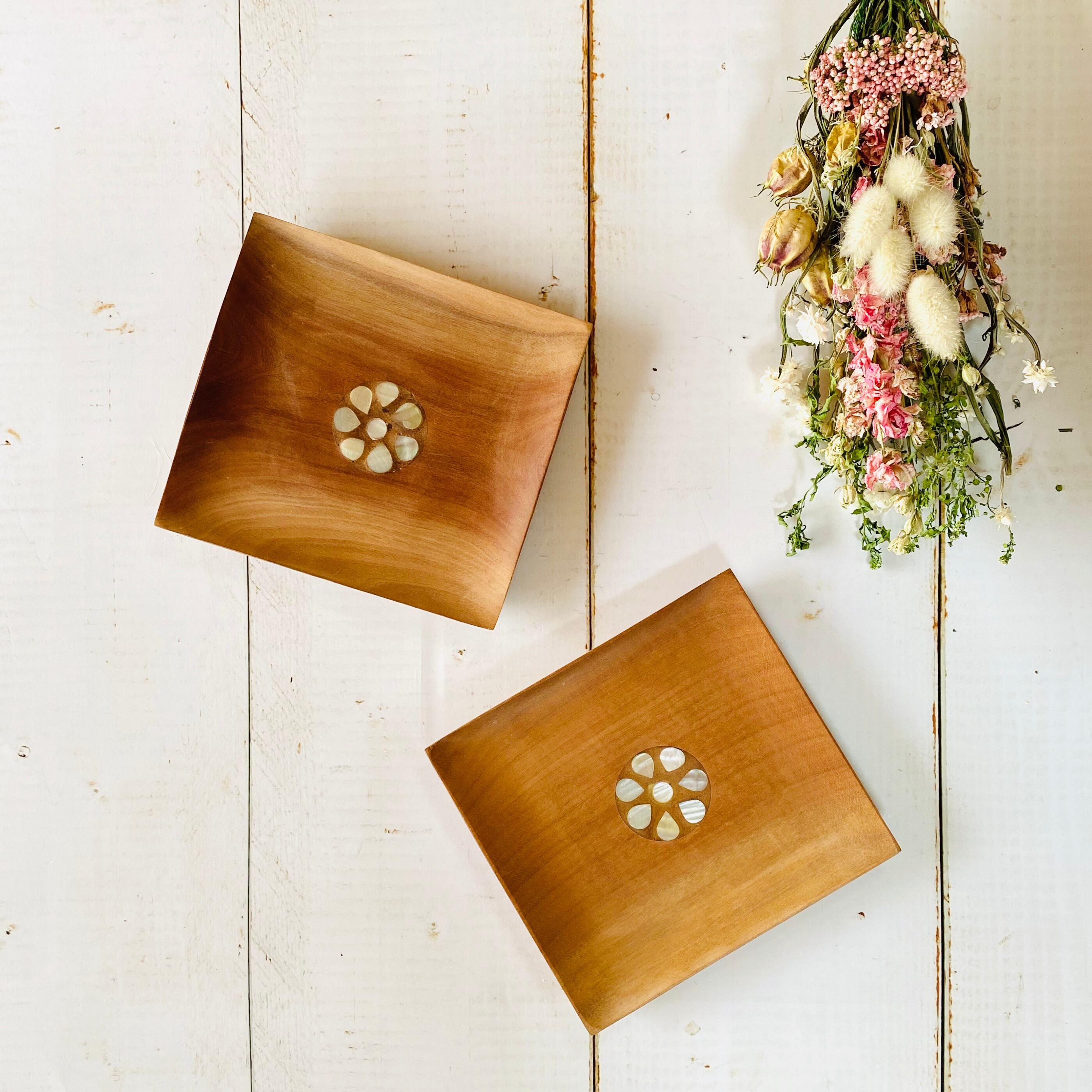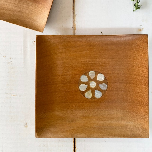 ご覧頂きましてありがとうございます♡ こちらは、中央にシェルを埋め込んだ美しいナチュラルウッドトレイです。 手触りも良く温かみのあるトレイです。 おしぼりをのせたり、ちょっとした小物置きとしてお使い下さい。 水洗いOKです。 サイズ 15×15 cm 素材 天然木、シェル