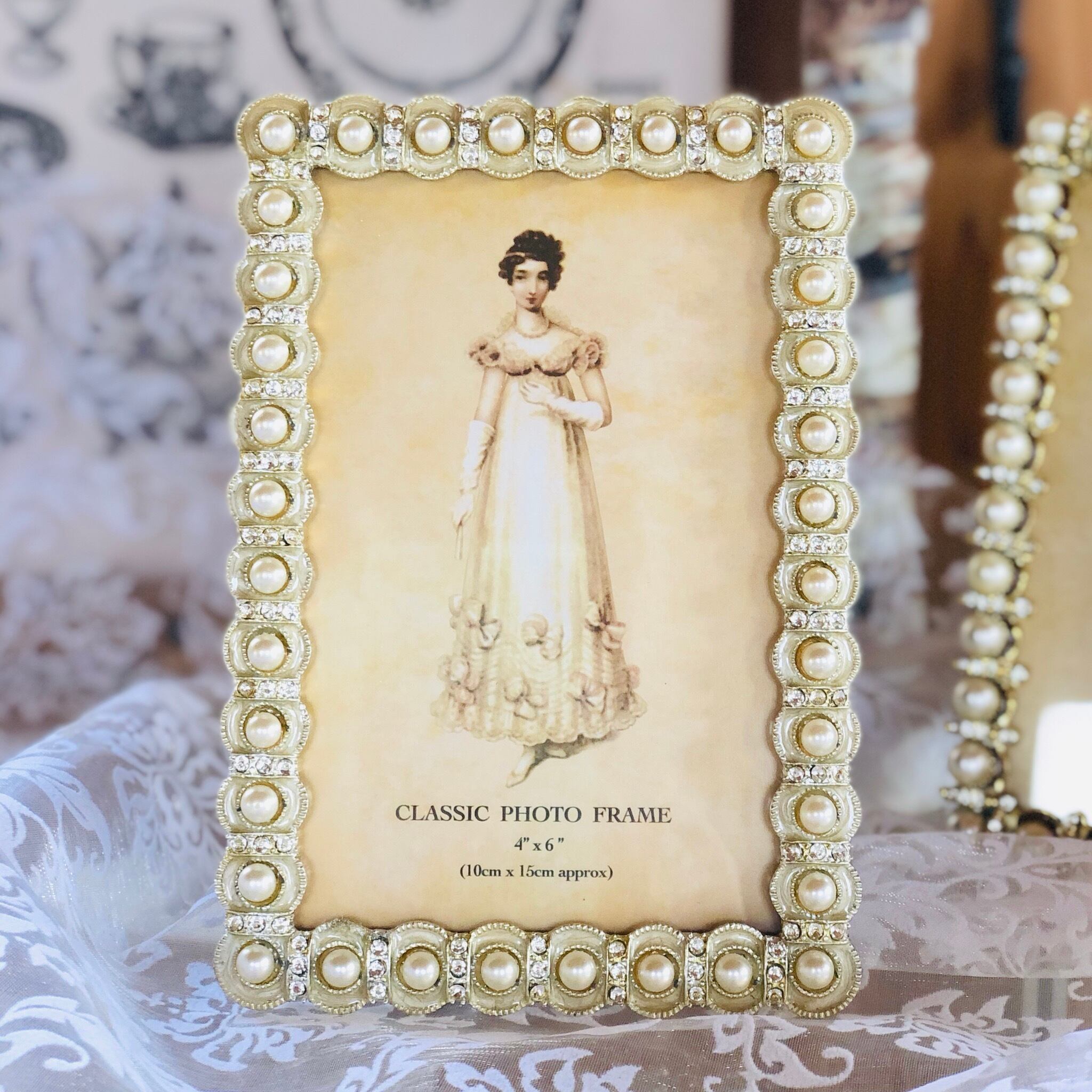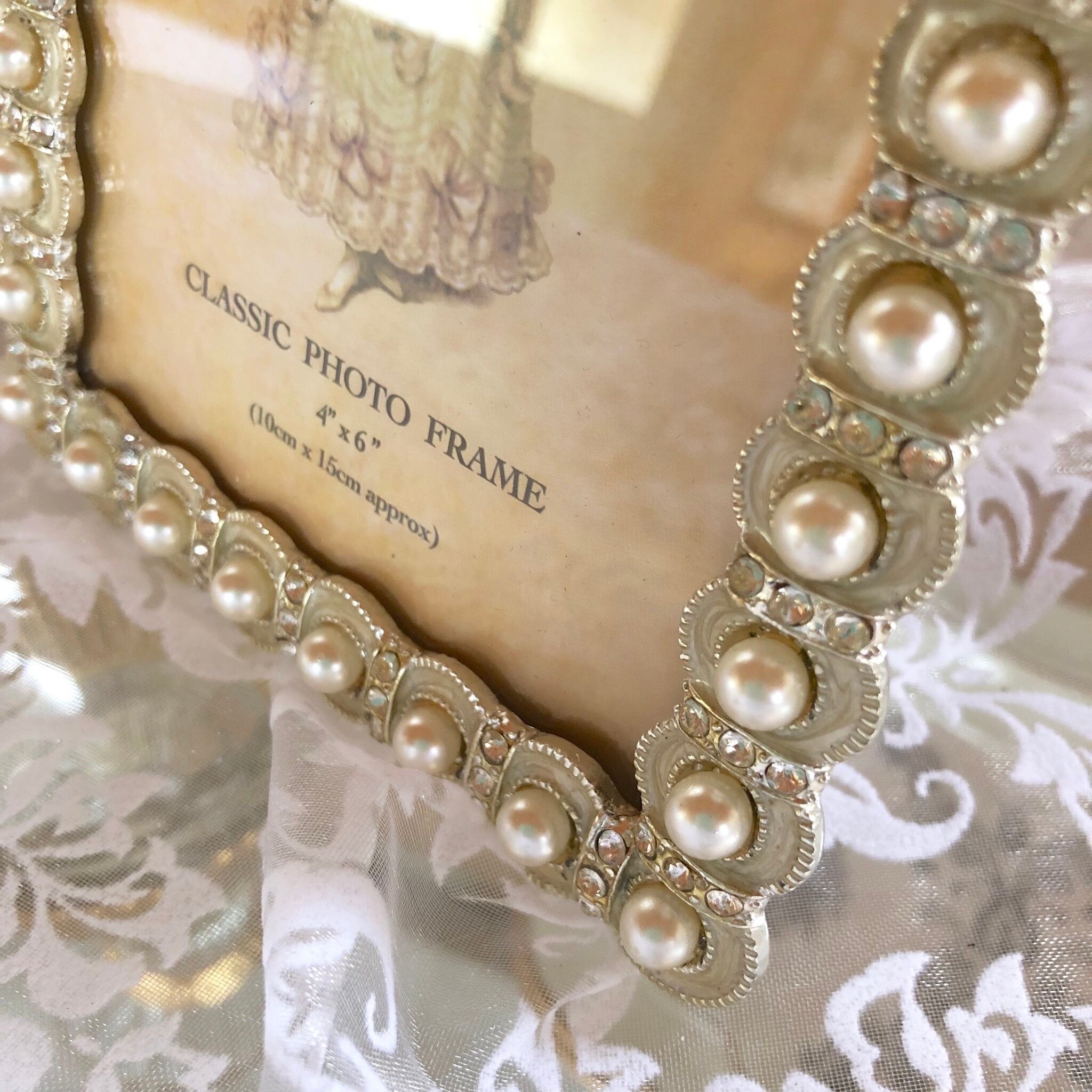 ご覧頂きましてありがとうございます♡ こちらは、大粒のフェイクパールとクリスタルの組み合わせで縁取られたとても上品な雰囲気のフォトフレームです。 縦と横、どちらでもお使い頂けます。 サイズ 17.5×12cm 素材 ピューター(シルバーフィニッシュ)