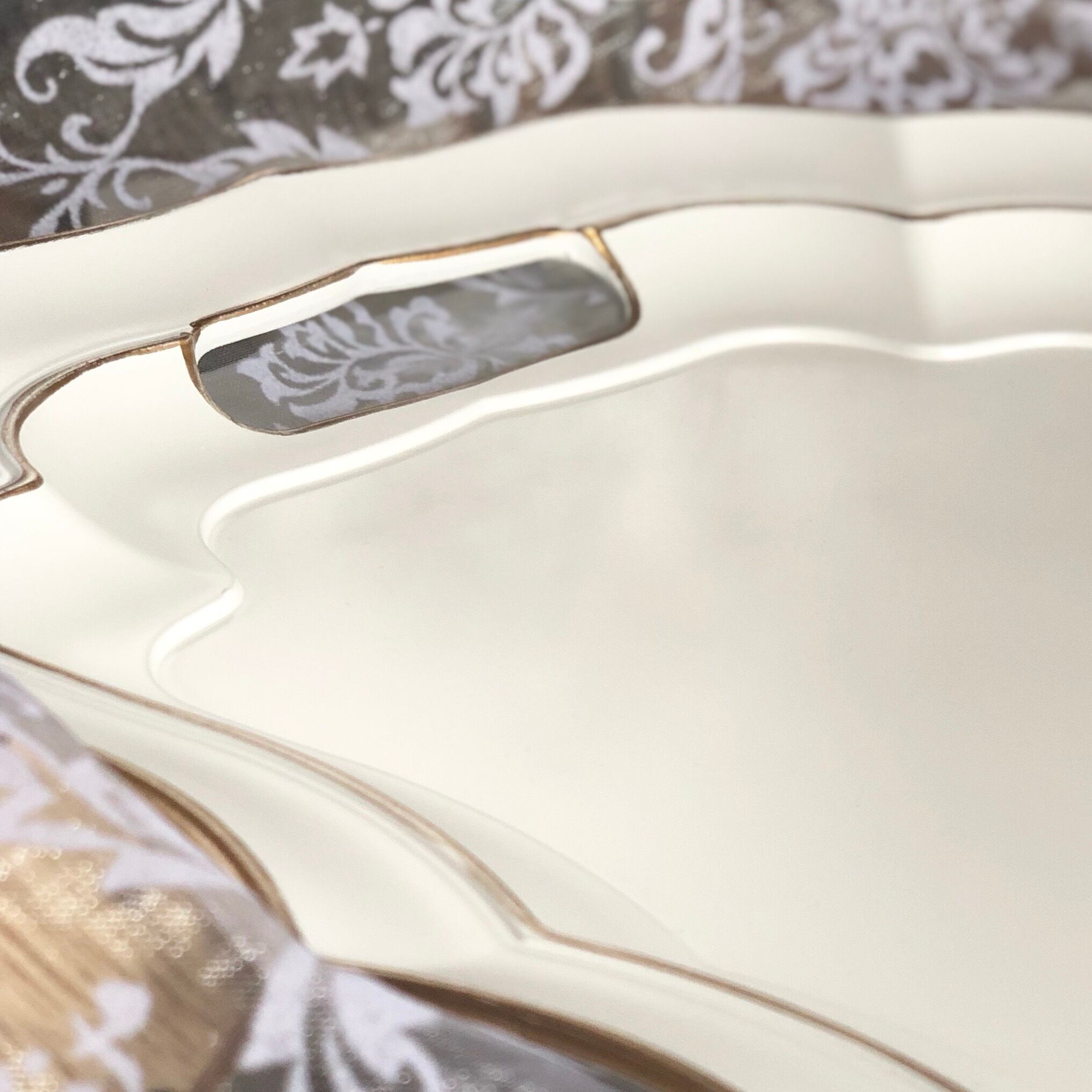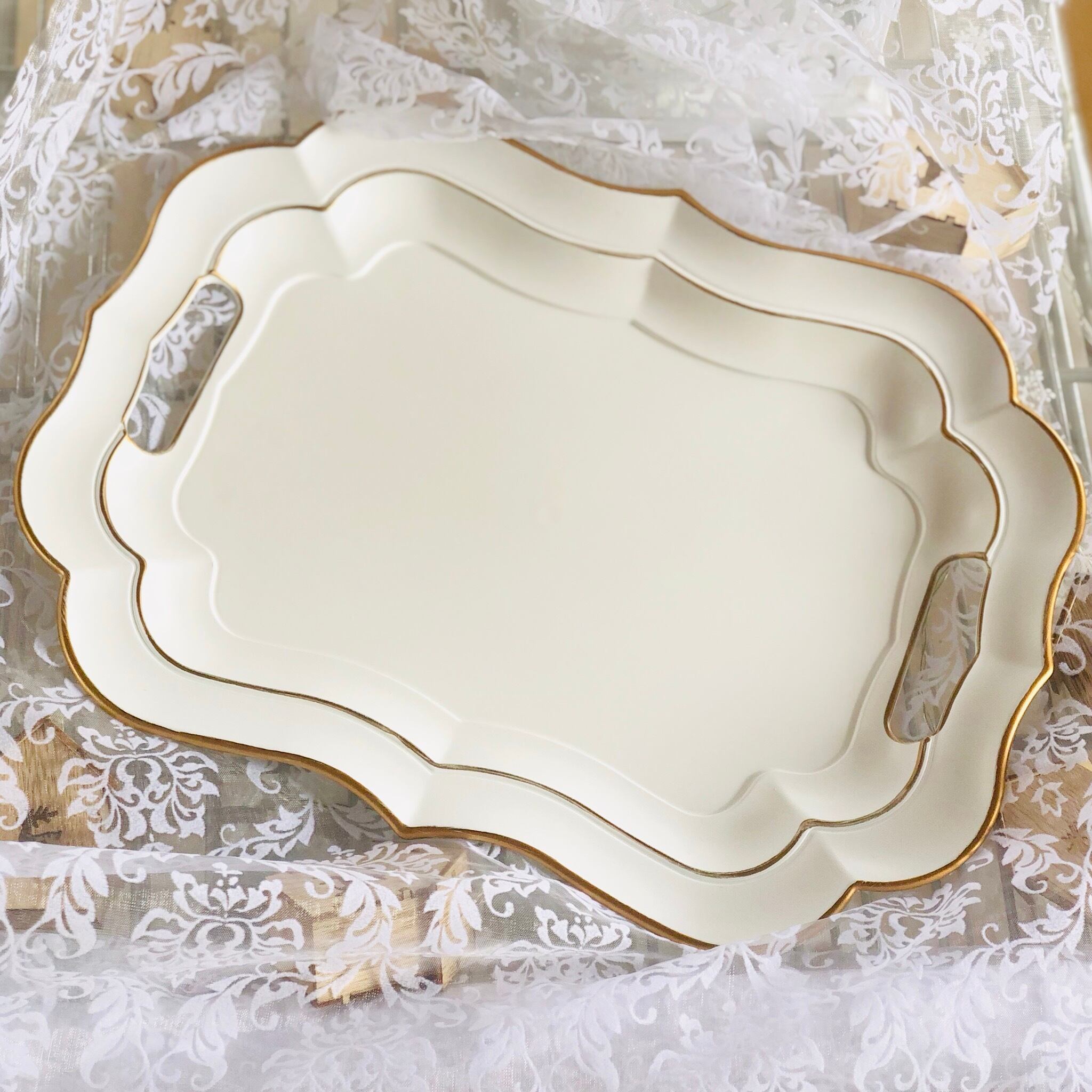 柔らかなアイボリーカラーに、ゴールドのハンドペイントラインがアクセントの軽くて使い勝手の良いプラスチックのトレイです。