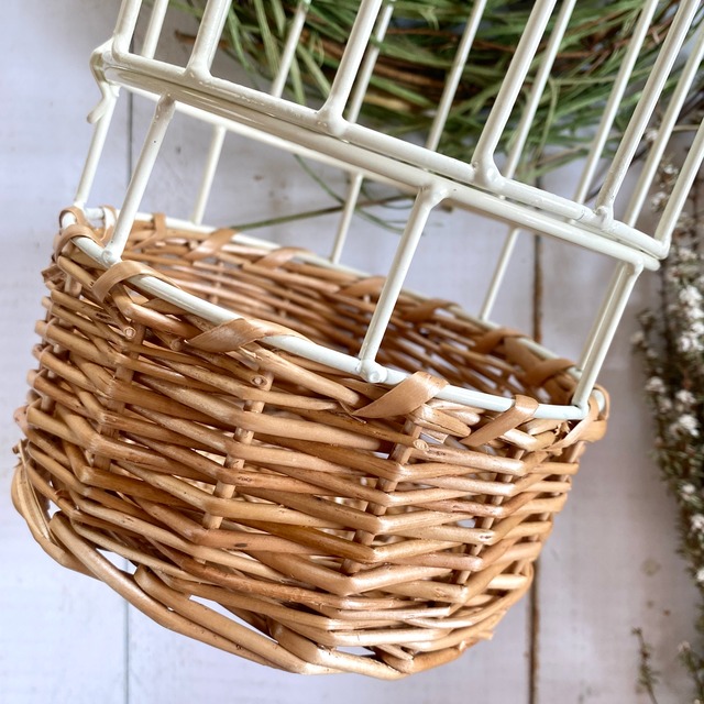 柳で編まれたバスケット部分とワイヤーで組み合わされたバードケージです。 蓋の開閉ができるので、お花やグリーなどを入れて飾ることができます。 置いてもぶら下げても可愛いらしいフォルムです。 サイズ 直径約14cm 高さ約29cm