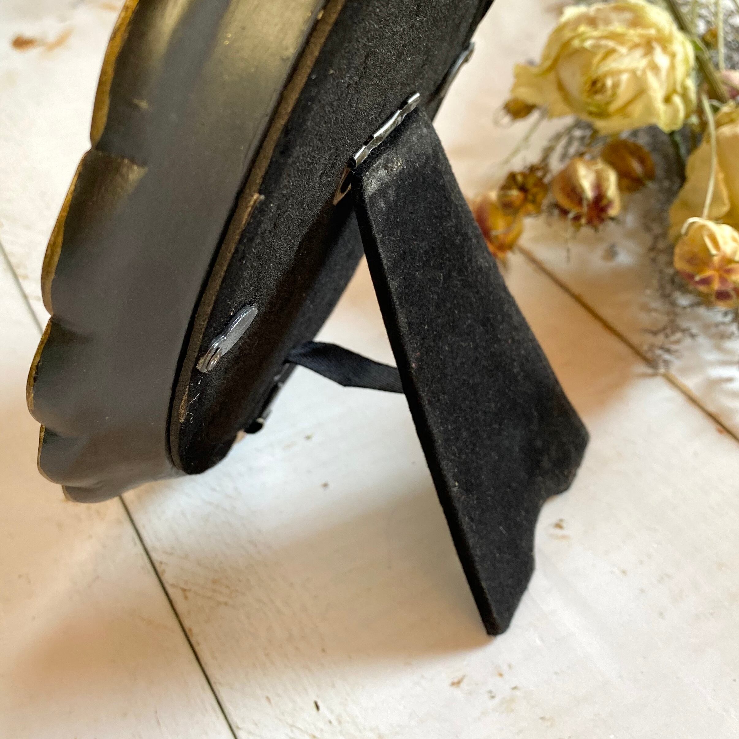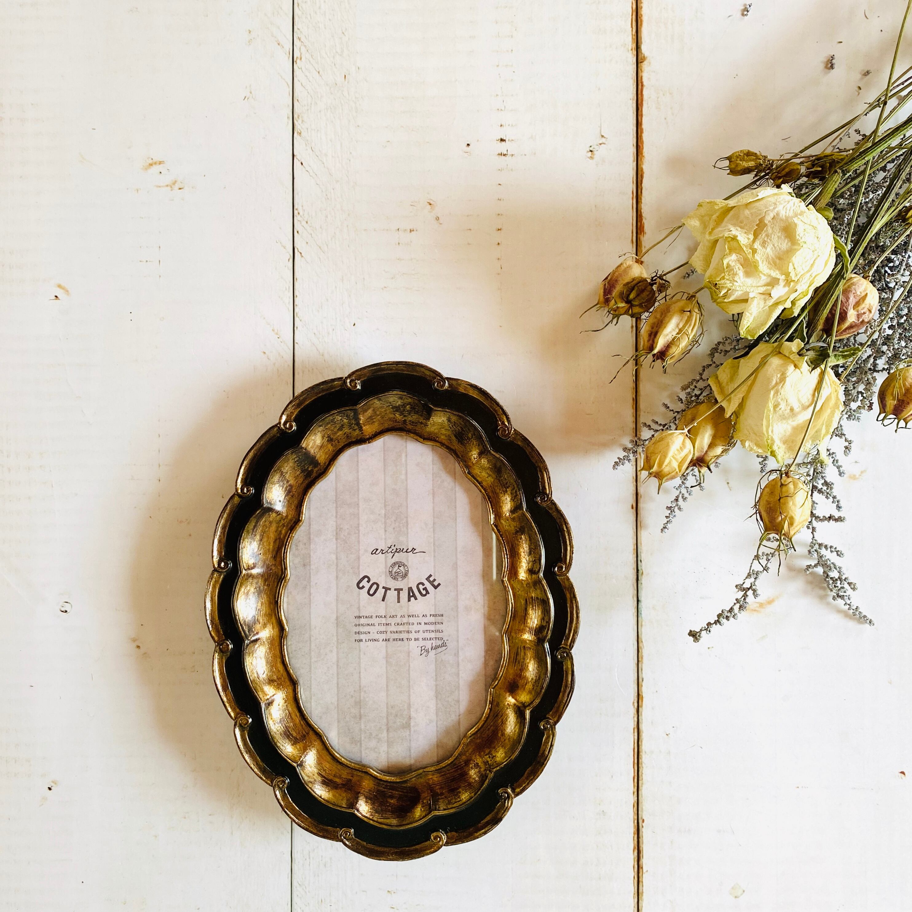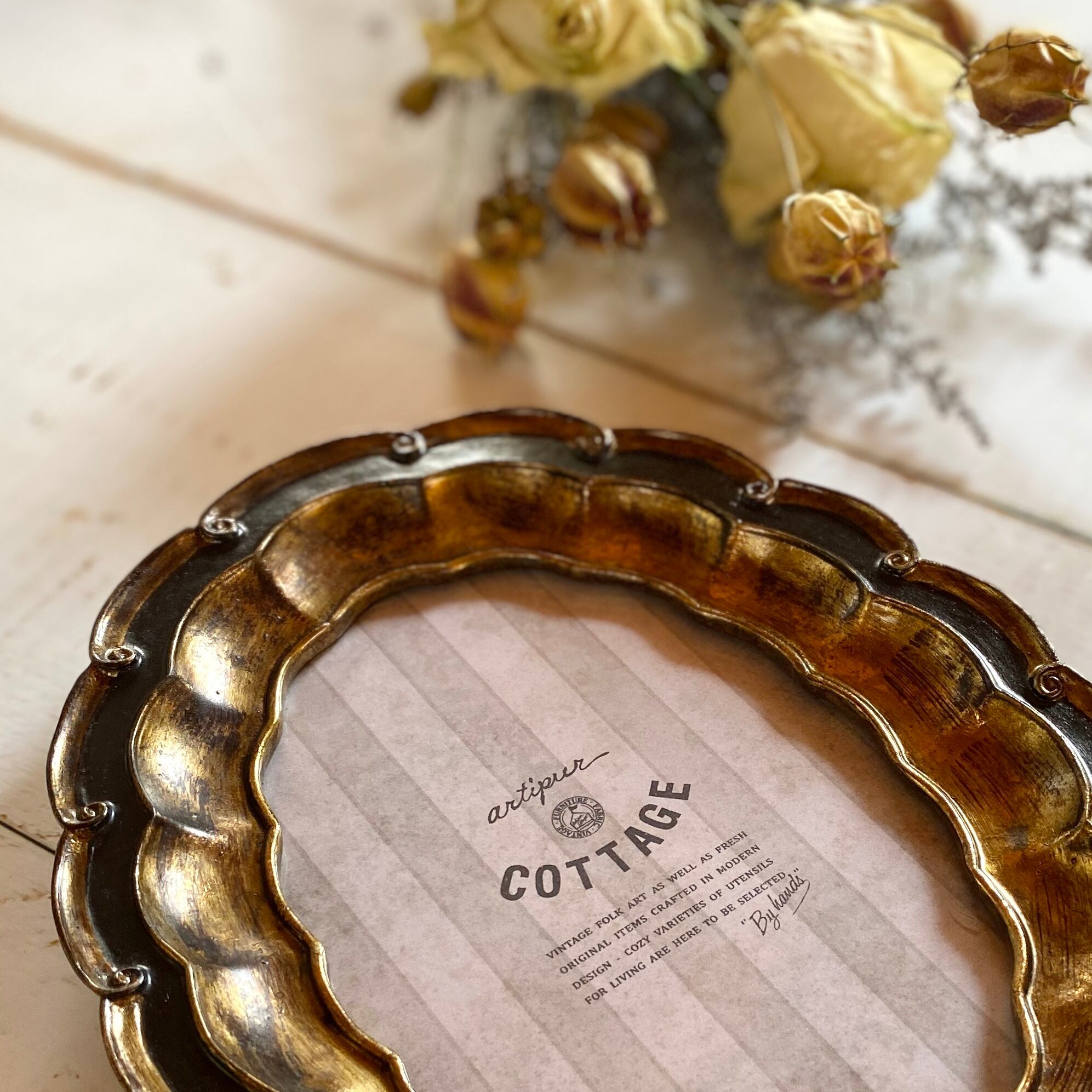 アンティークな雰囲気のあるオーバル型のフォトフレームです。 波型のフレームですので、シンプルなデザインのものとはまた違った雰囲気を演出してくれます。 アクセサリーや鍵などを置いても素敵だと思います。 ※塗りムラには個体差があります。 サイズ 15.5×20.5cm (窓9.5×14.5cm)