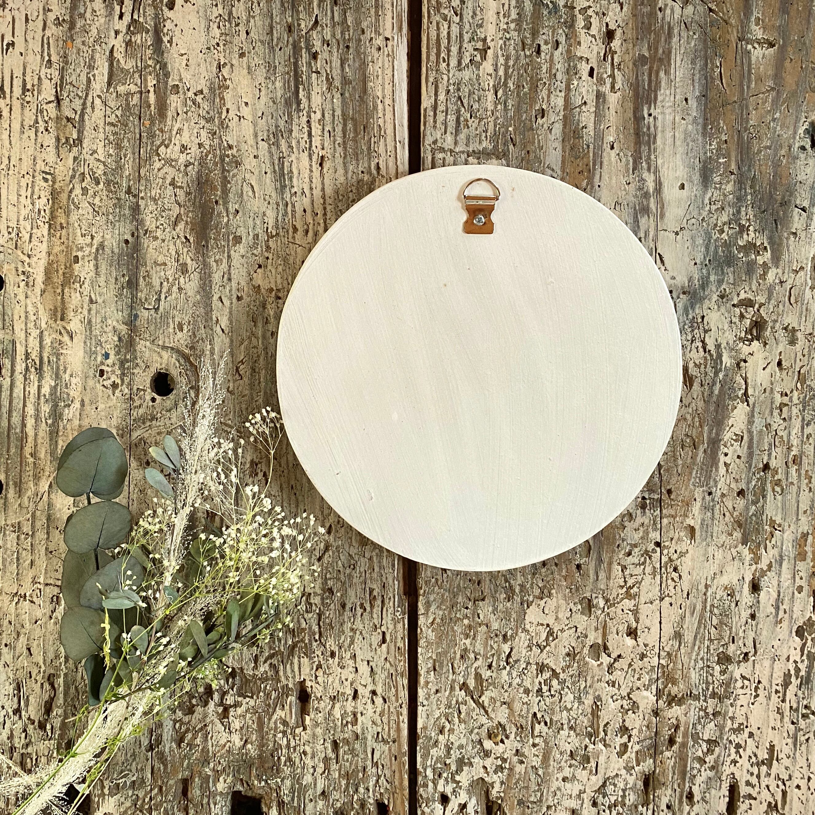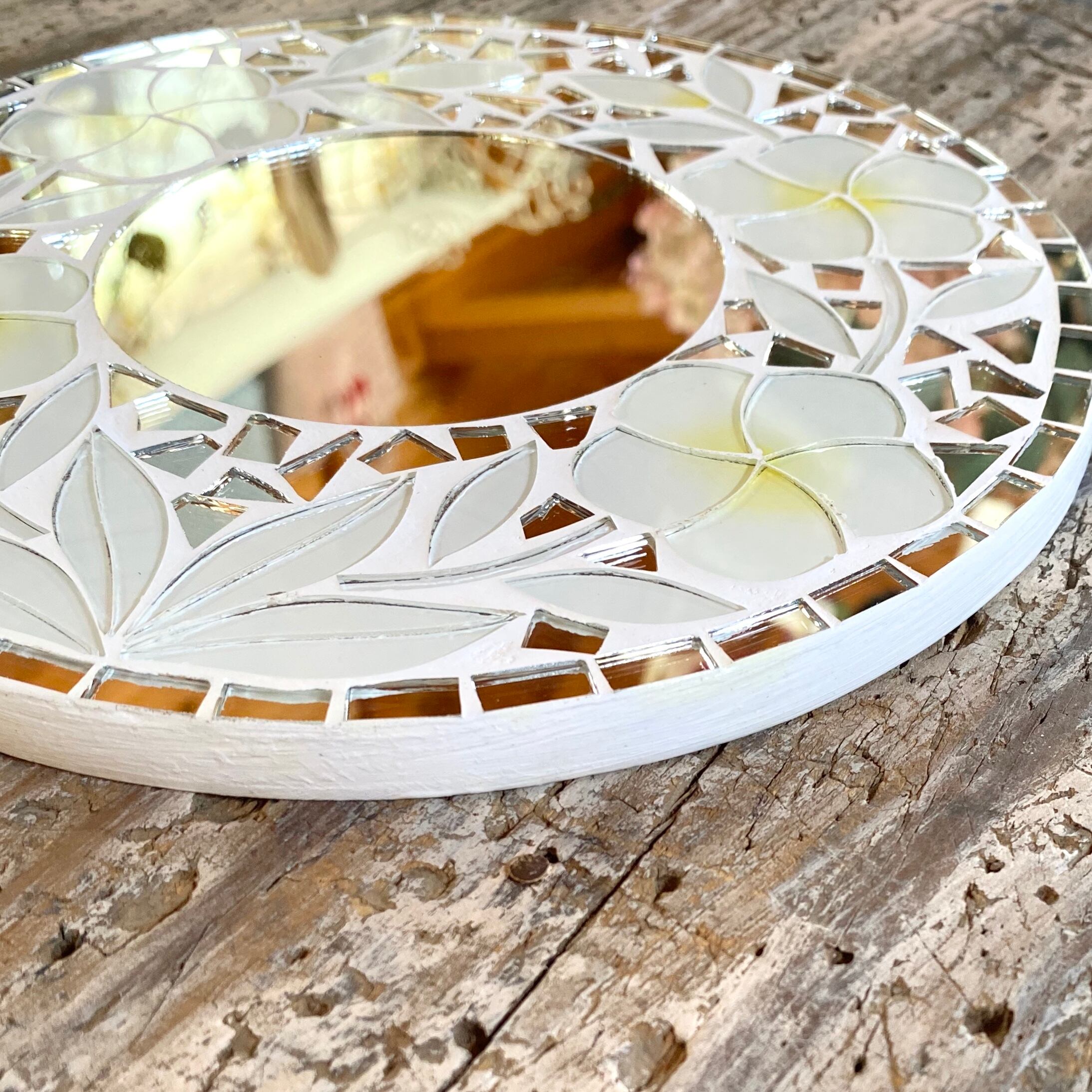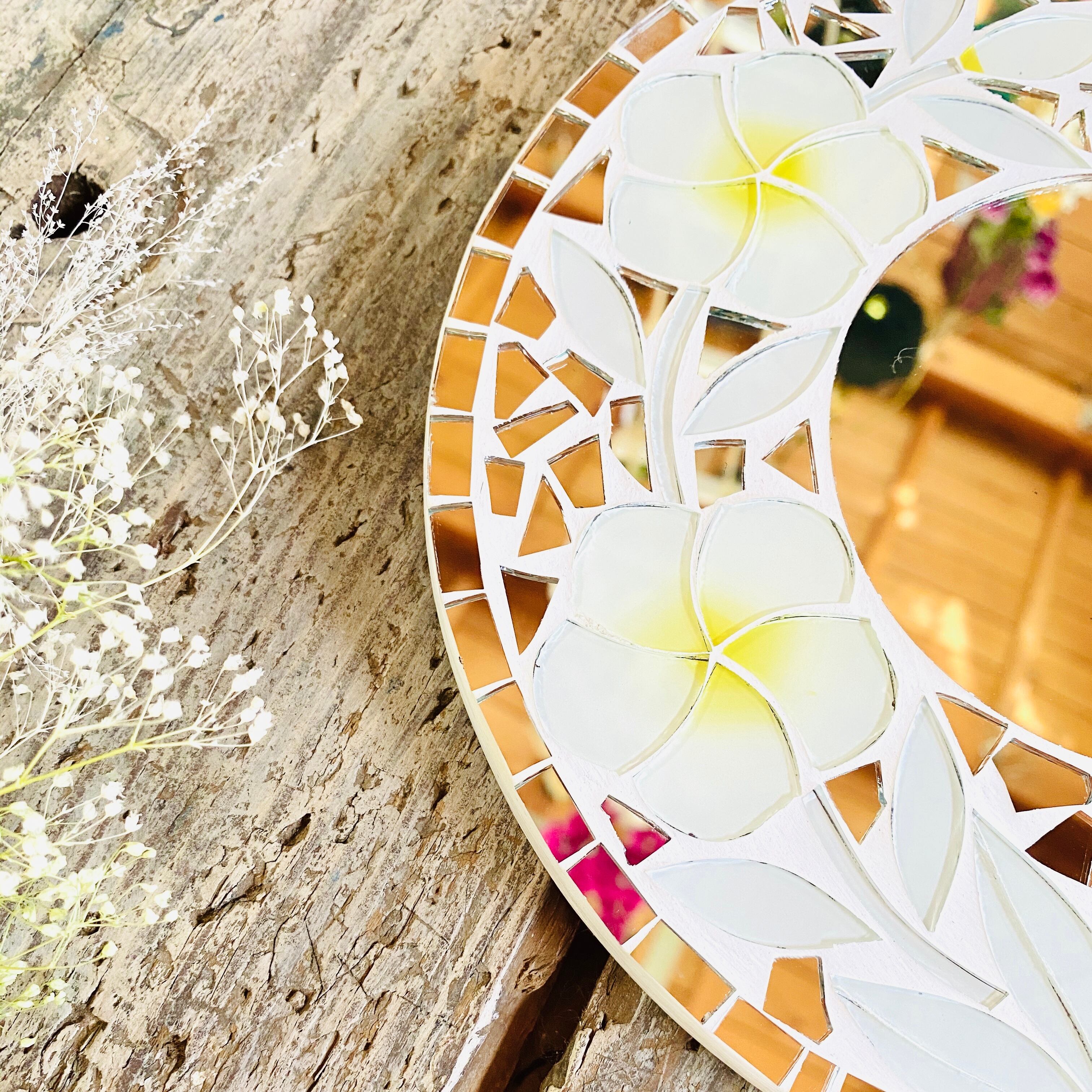 プルメリアの花をデザインしたガラスがとても美しい壁掛けミラーです。 真ん中が円形のミラーになっています。 全体的にミラーが散りばめられていますので、キラキラとした雰囲気で本当に可愛らしいです。 サイズ 本体 φ約20cm 厚み約1cm ミラーの部分のφ約9cm