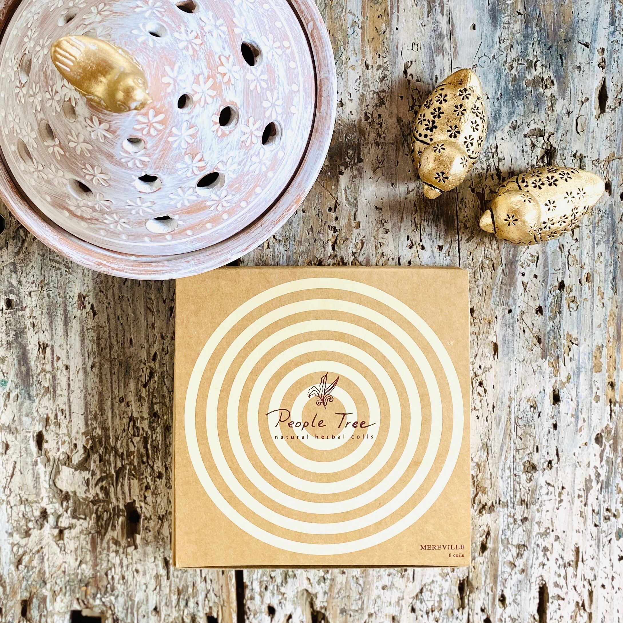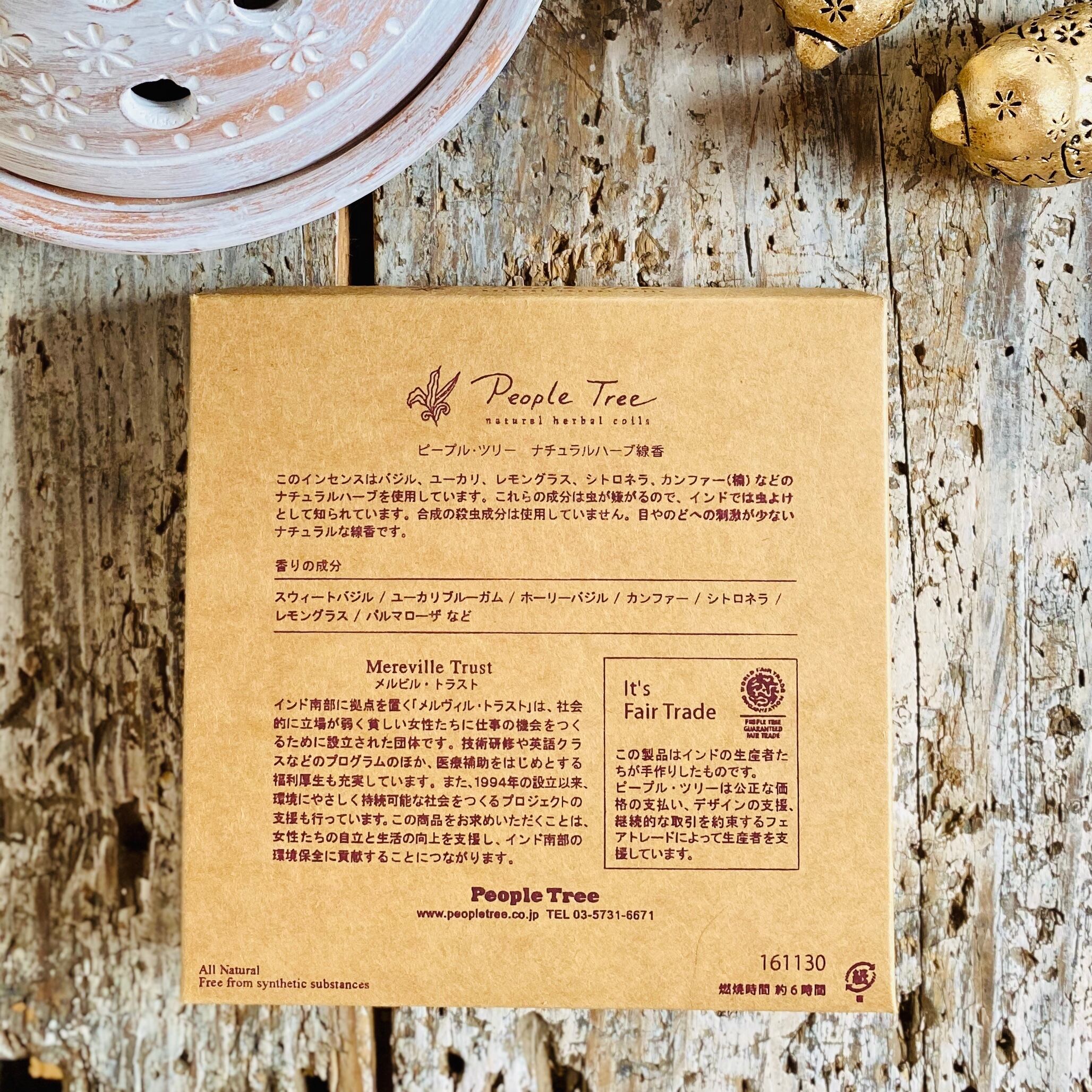 ユーカリブルーガム、カンファー、シトロネラ、レモングラスにカミメボウキ(ホーリーバジル)など3 種類のバジルをブレンド。インドで蚊が嫌う香りとして知られている植物を使ったさわやかな香りのアロマ線香です。