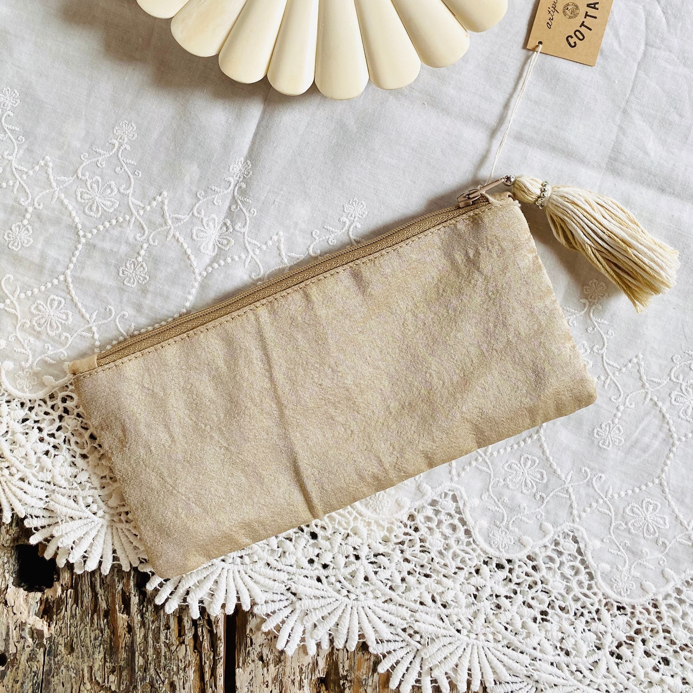 細やかなビーズがふんだんに施された横長タイプのポーチです。 ペンケースや小物入れなどにお使い頂けます。 色違いもご紹介していますのてどうぞご覧くださいませ。 サイズ 幅約20cm 高さ約10cm 生産地 インド