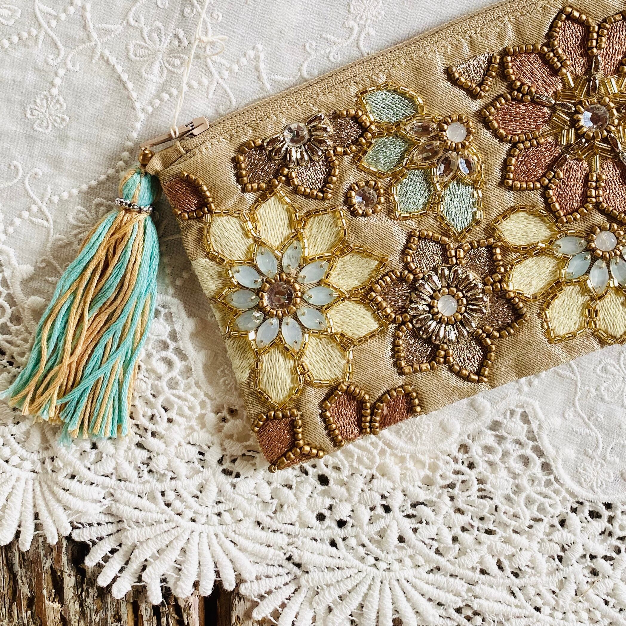 細やかなビーズがふんだんに施された横長タイプのポーチです。