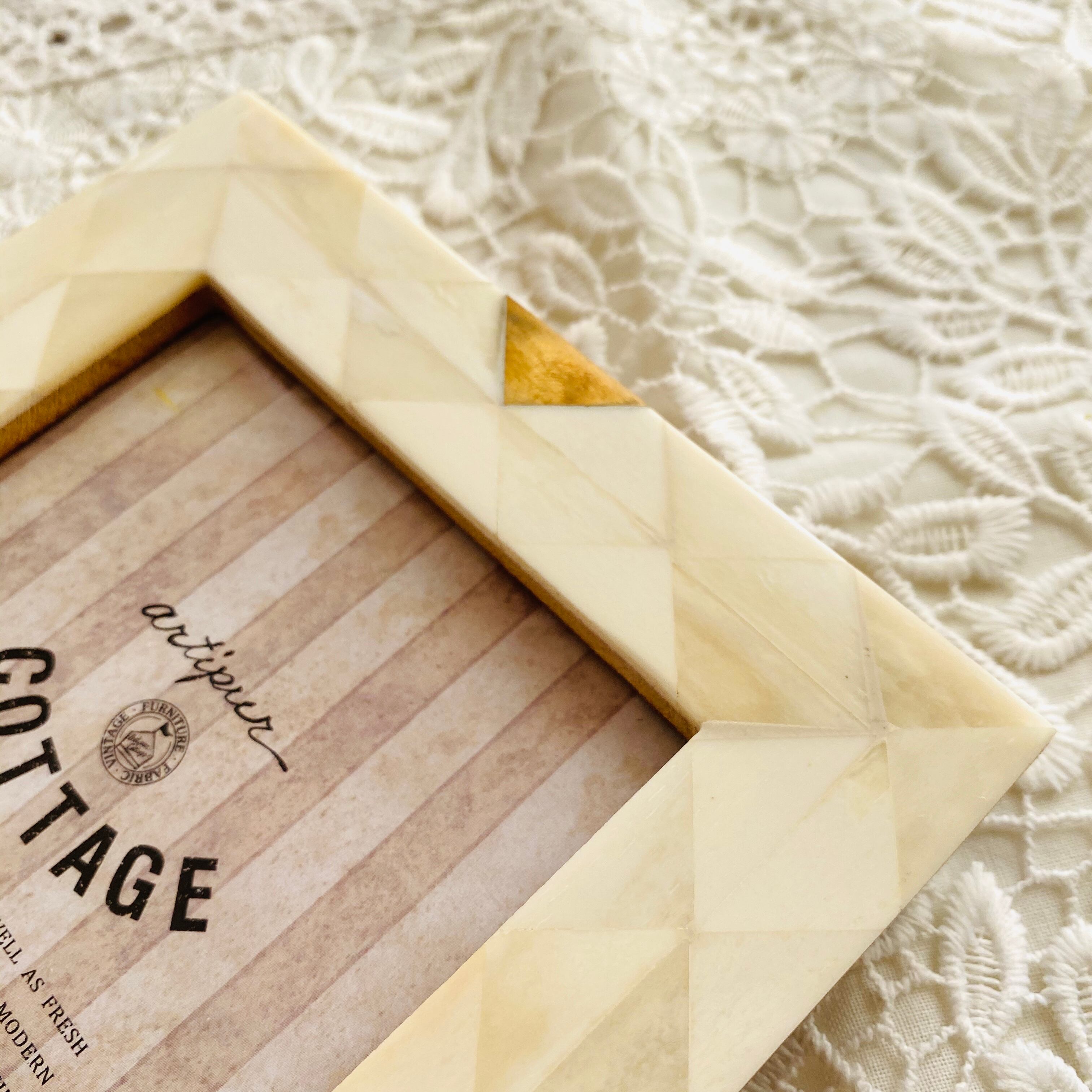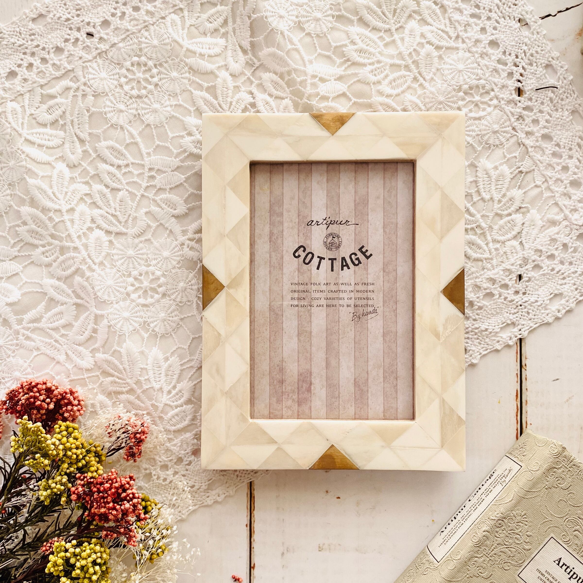 バッファローボーン(骨)とホーン(角)を組み合わせて作られたとてもお洒落なフォトフレームです。 ダイヤのデザインの濃淡が表情をプラスしています。 サイズ 本体約14×19cm 窓サイズ約9×14cm 素材 バッファローボーン/ホーン ブラス