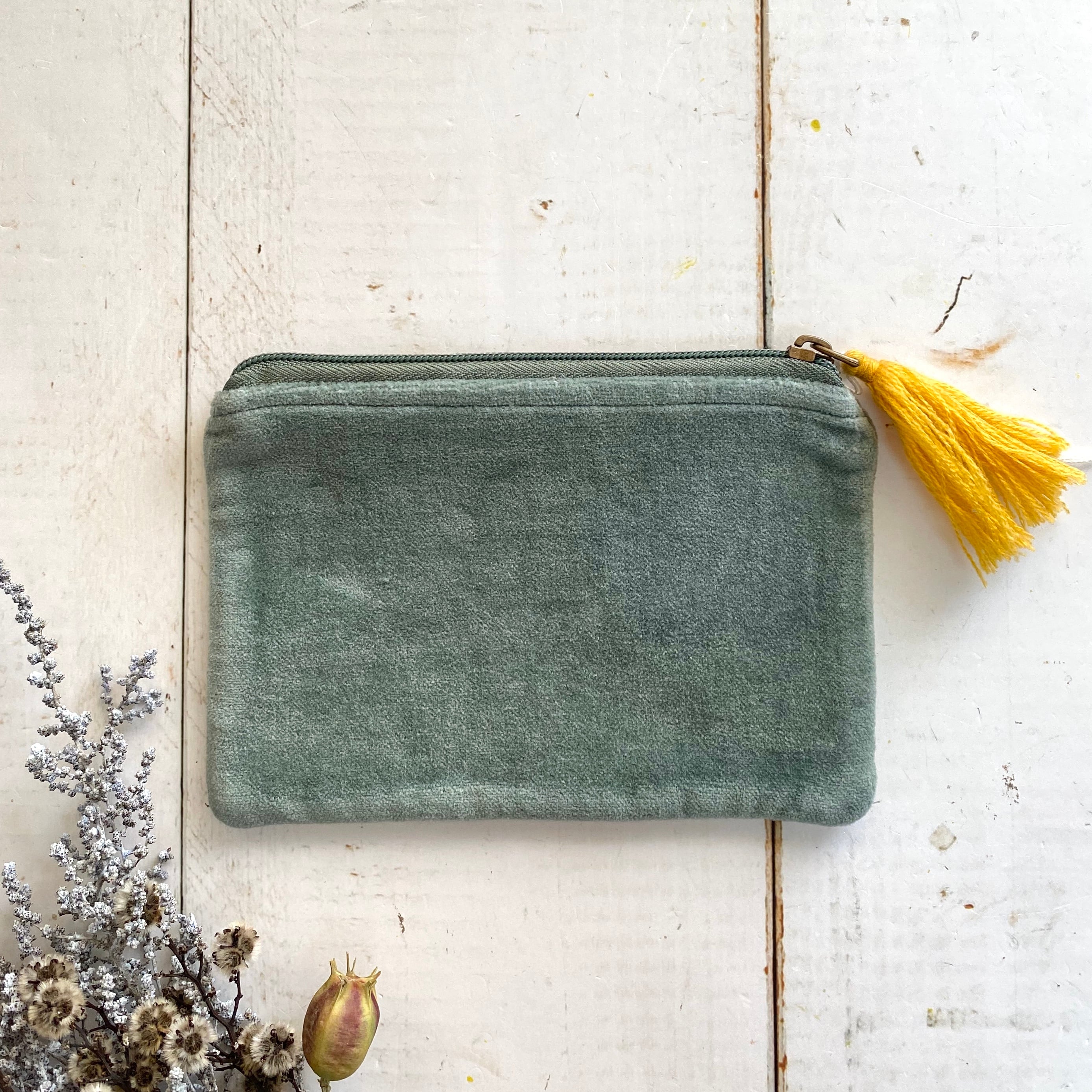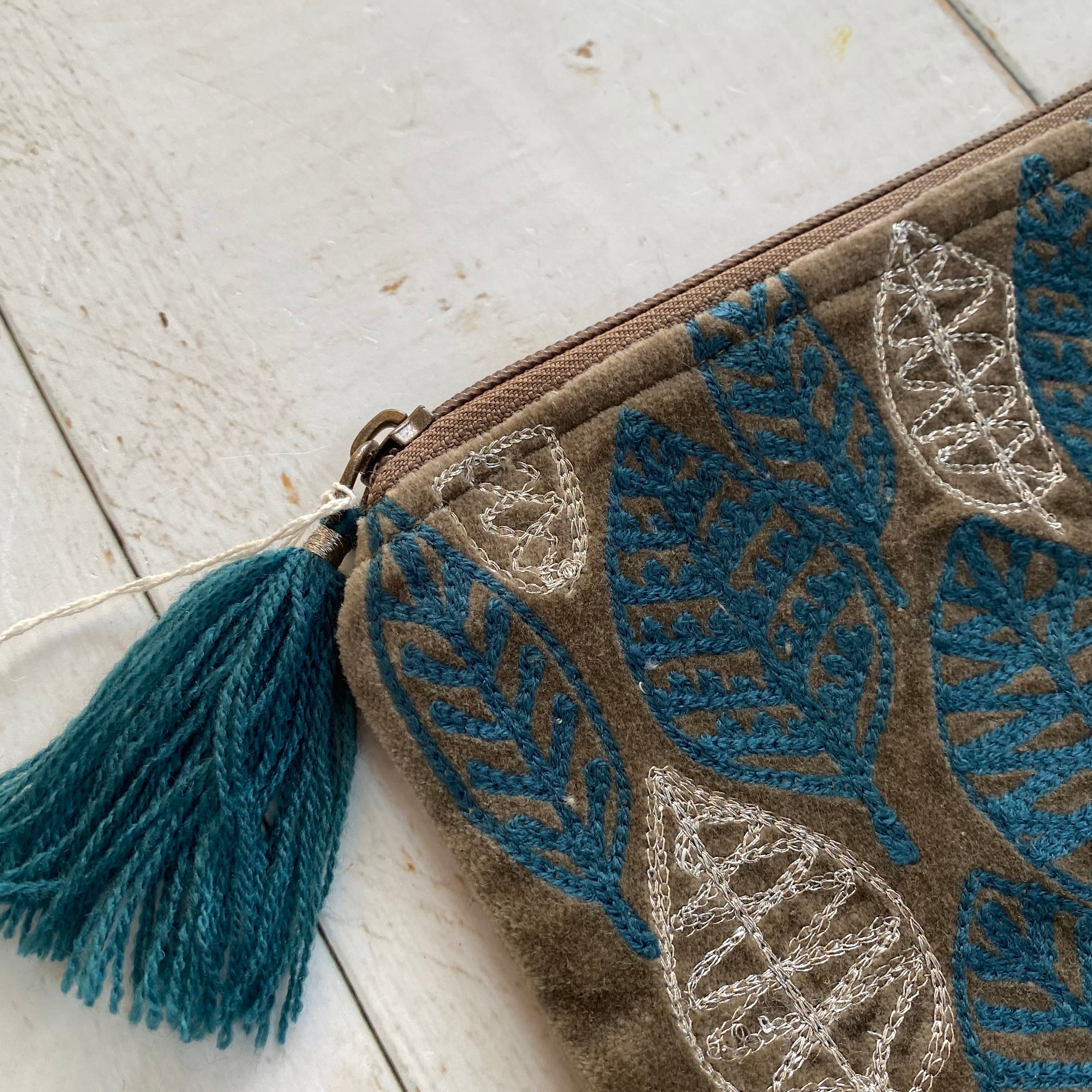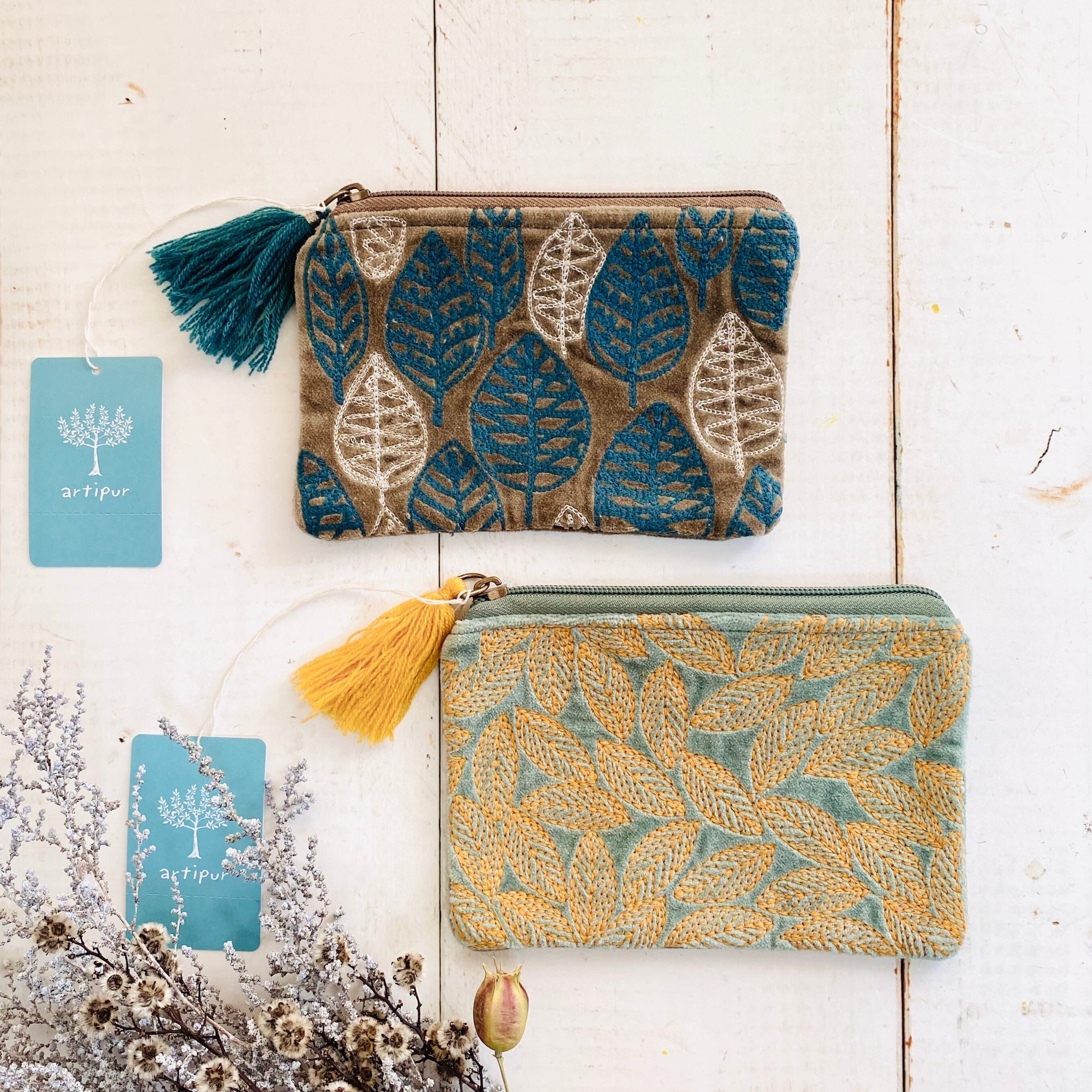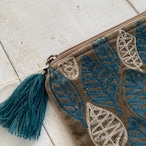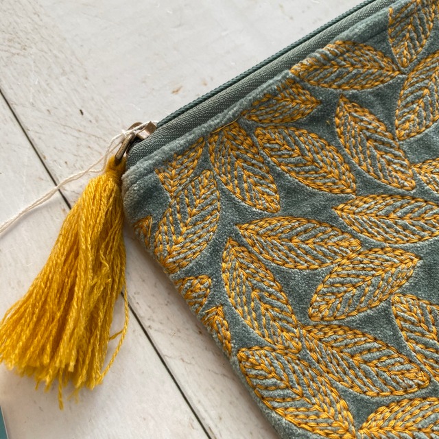 肌触りの良いコットンベロアにリーフモチーフの刺繍が施されたフラットポーチです。 可愛いらしいサイズですので、バッグにもかさばらずに収めることができると思います。 ご注文の際はタッセルの色でご指定くださいませ。 サイズ 約11×16cm