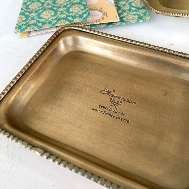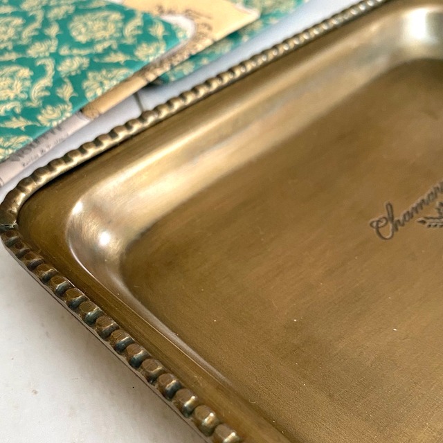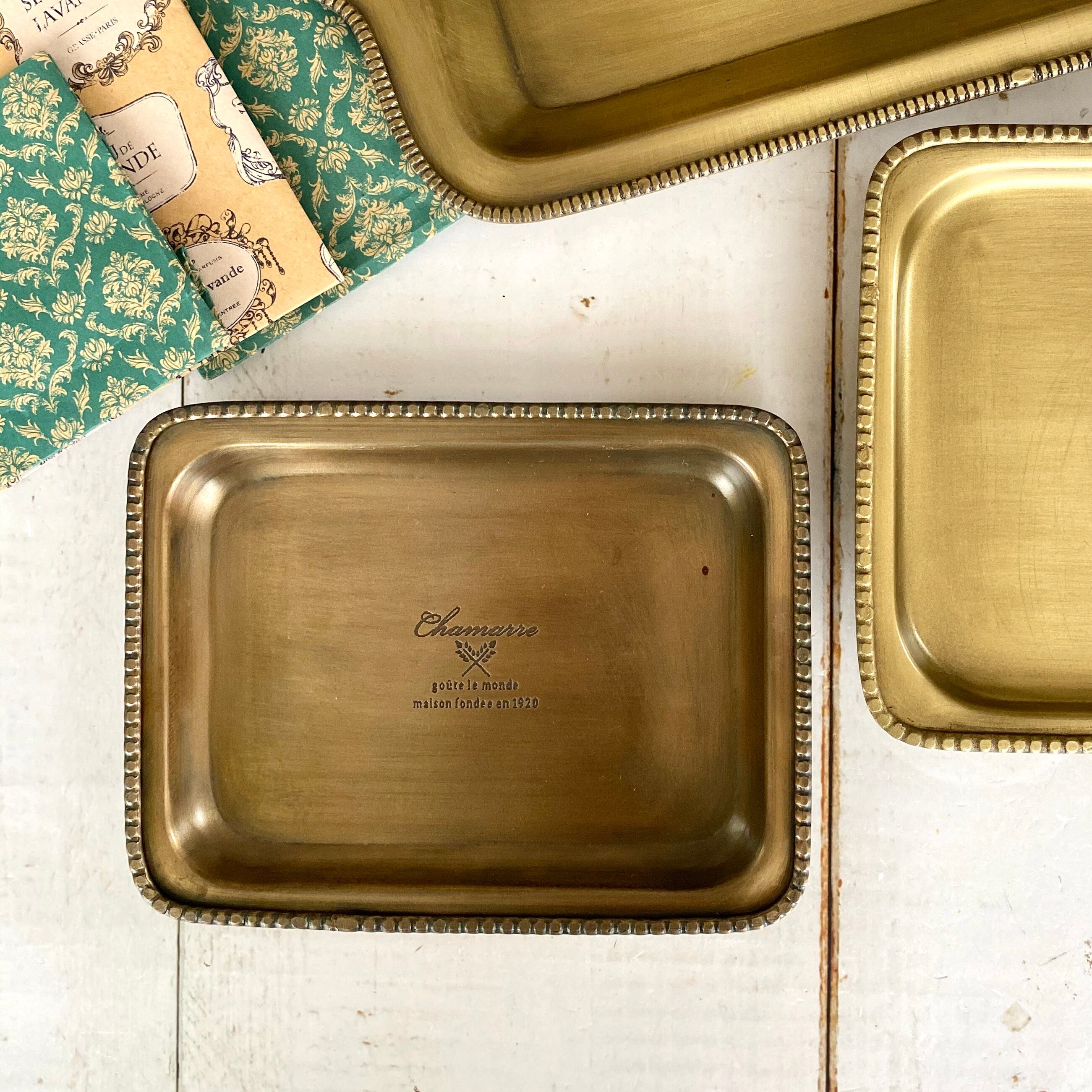 長年使われていたようなアンティーク感を感じさせるトレイです。 中央部分の文字がとてもお洒落な雰囲気です。 ※ブラスコーティングが施こされています。 サイズ 約巾15×奥11.5×高1.5cm 素材 アイアン