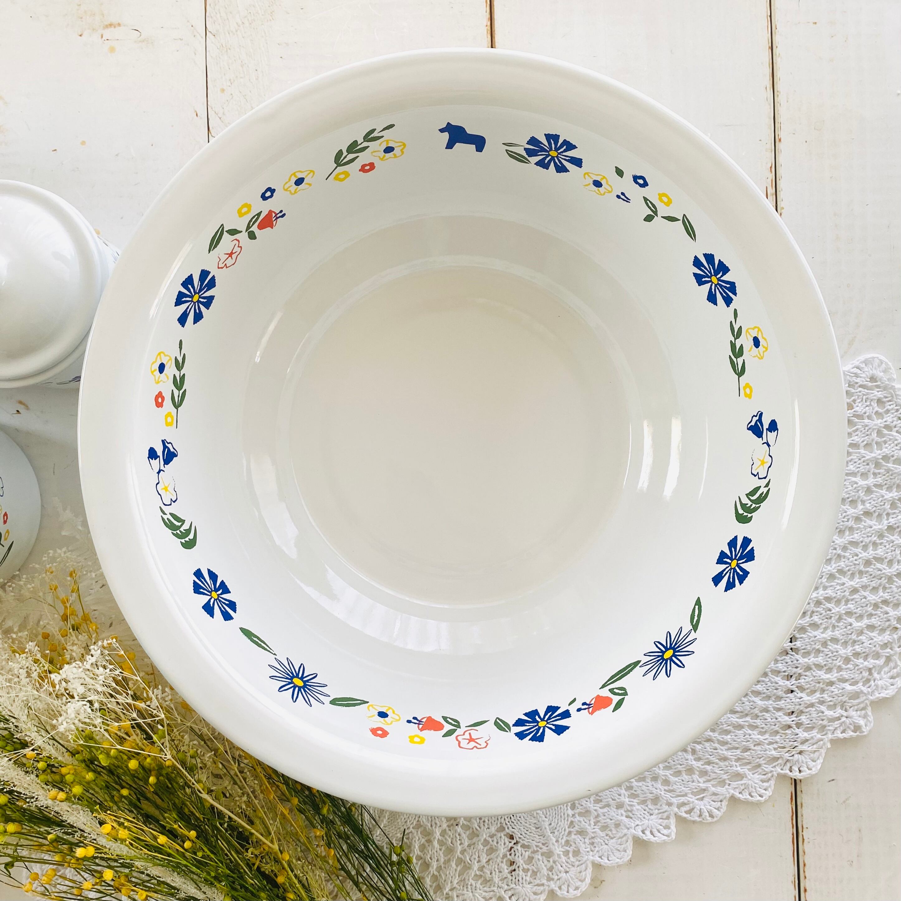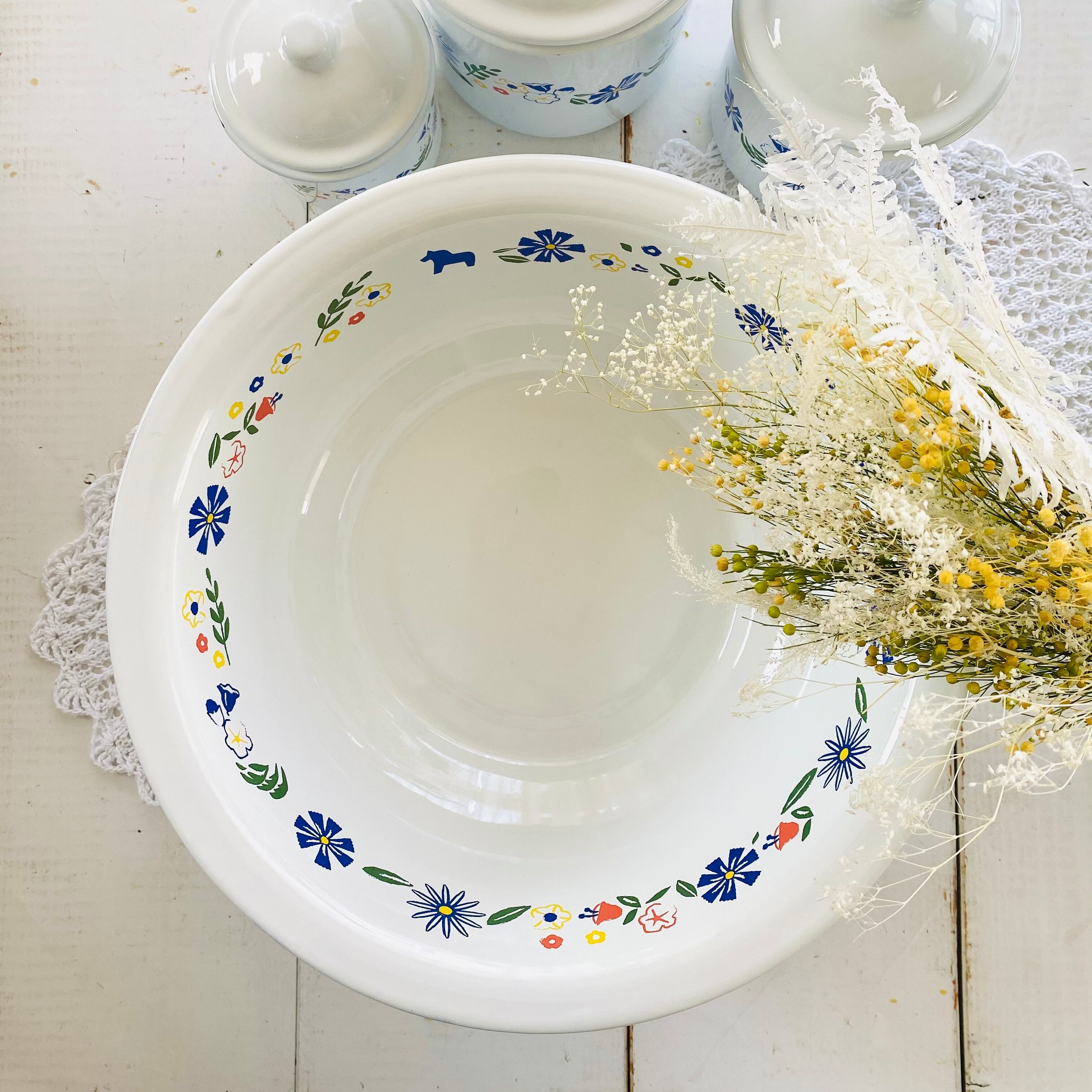真っ白なホーローにカラフルなお花とダーラナホースが並んだ可愛らしいベイシンです。