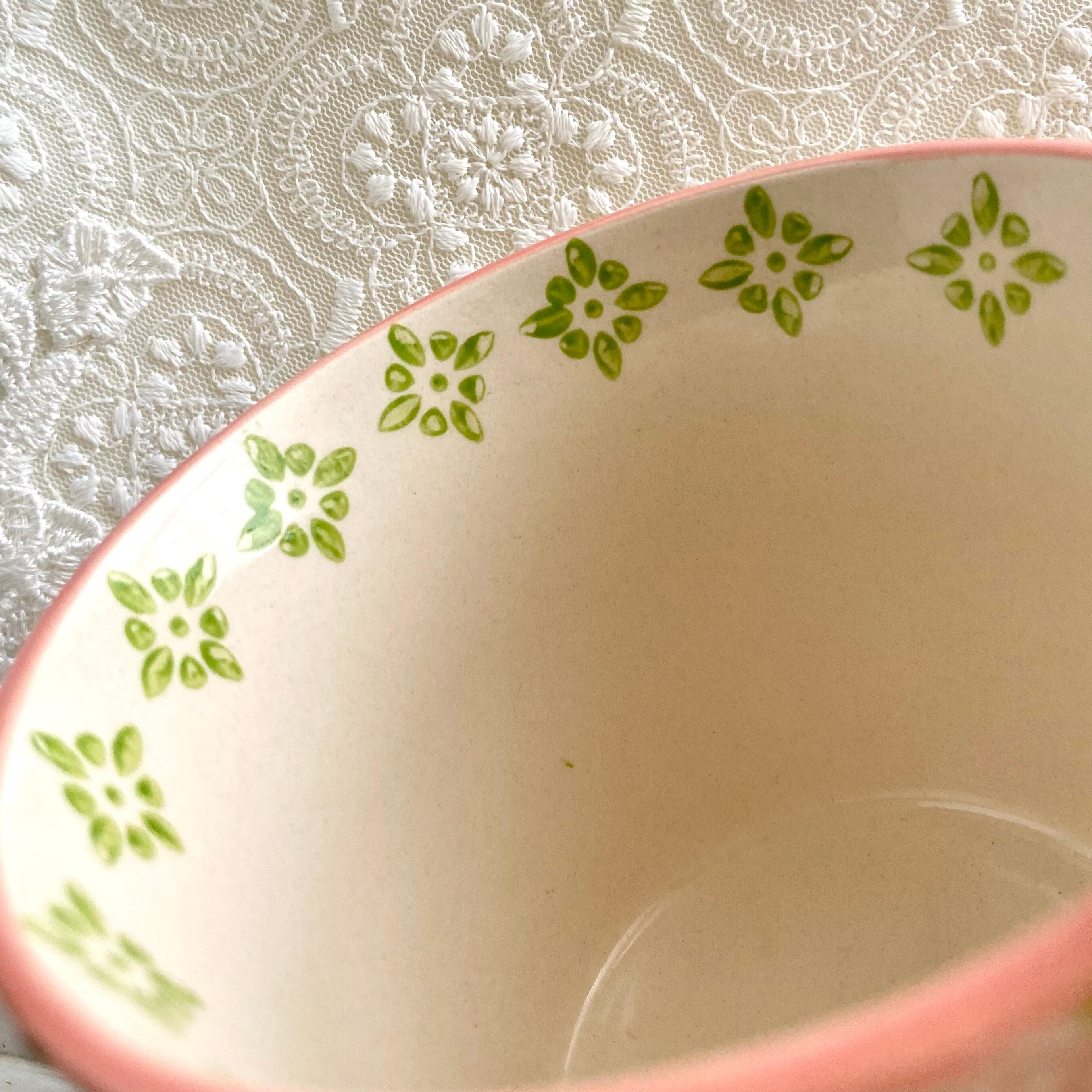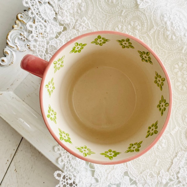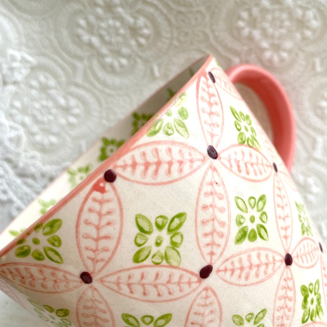 ハンドメイドアートのマグカップです。 お揃いで使いたくなる可愛らしさです。 小さな丸い粒の部分はイッチン技法で、少し盛り上がっています。 化粧箱付きですので、プレゼントにもおすすめです♪ 約W115(75)×H75mm 容量:約340ml 箱付き 素材 陶器