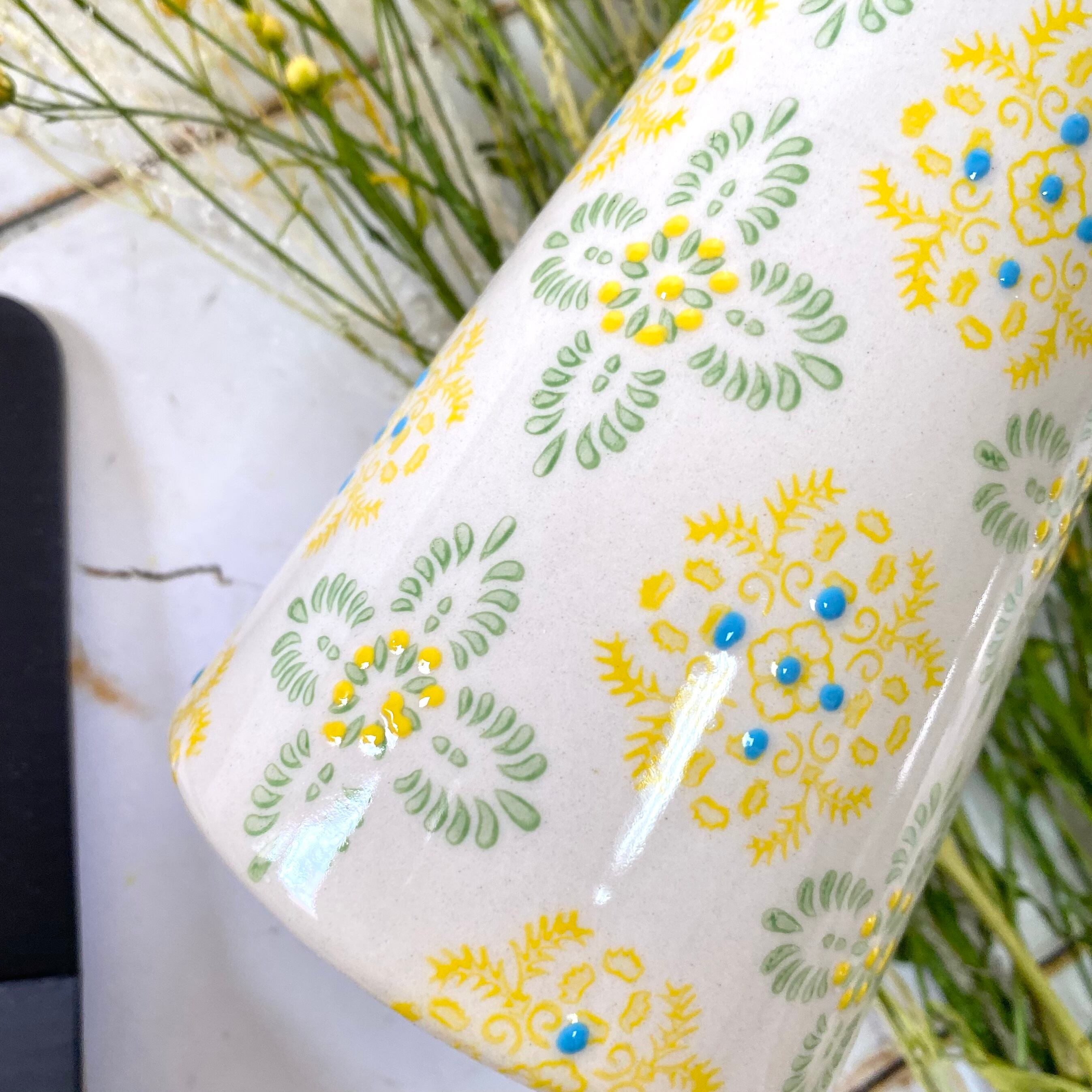 春らしい色のハンドメイドアートのフラワーベースです。 小さな丸い粒の部分はイッチン技法で、少し盛り上がっています。 お揃いのマグカップもご紹介していますので、どうぞご覧くださいませ♪ サイズ 約直径70(35)×H140mm 素材 陶器