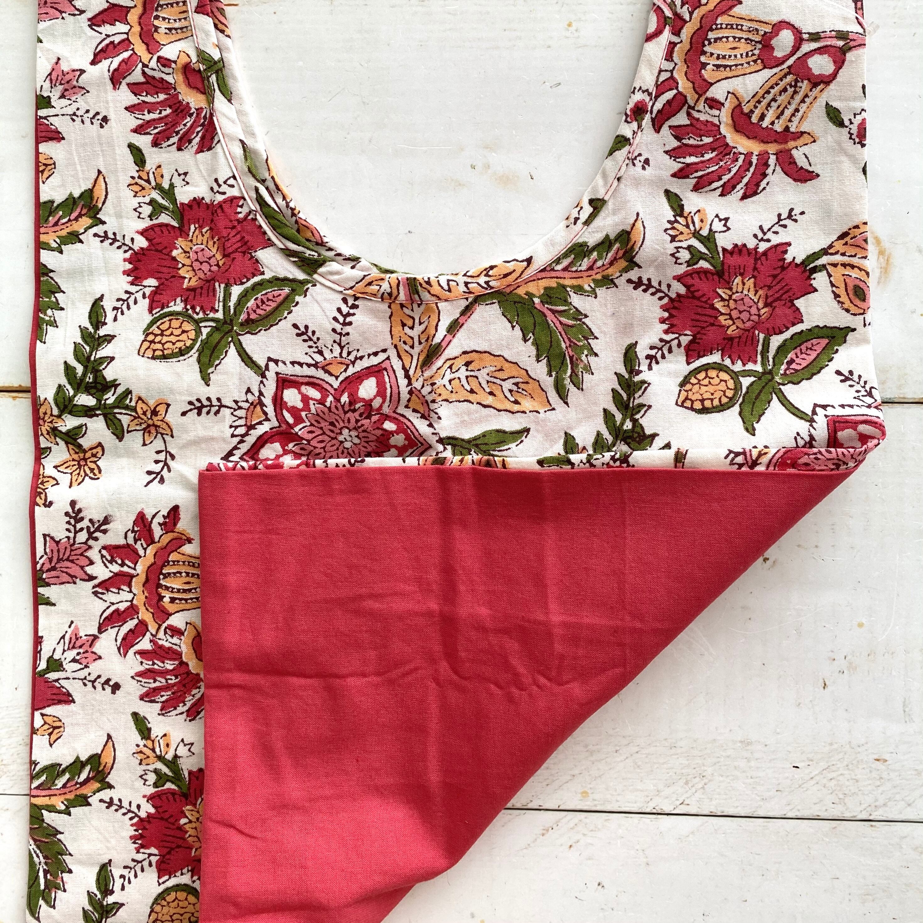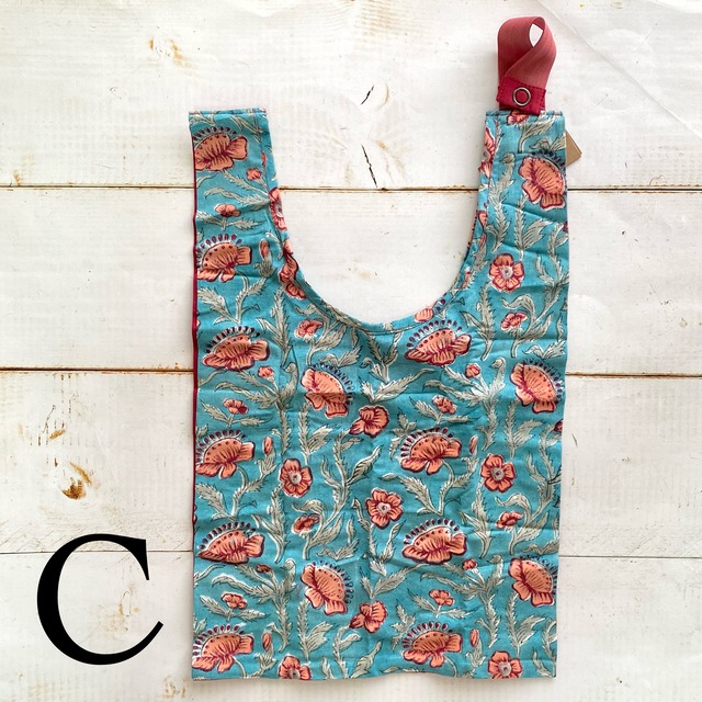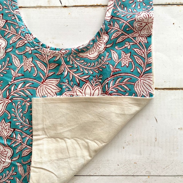 ブロックプリントのエコバッグです。 ハンドブロックでひとつづつ仕上げられています。 手仕事で作られたナチュラルなエコバッグです。 くるくると巻いてスナップボタンで止めることができます。 サイズ 約W30cm×H47cm(持ち手を含みます) マチ 約19cm 生産地 インド 素材 コットン