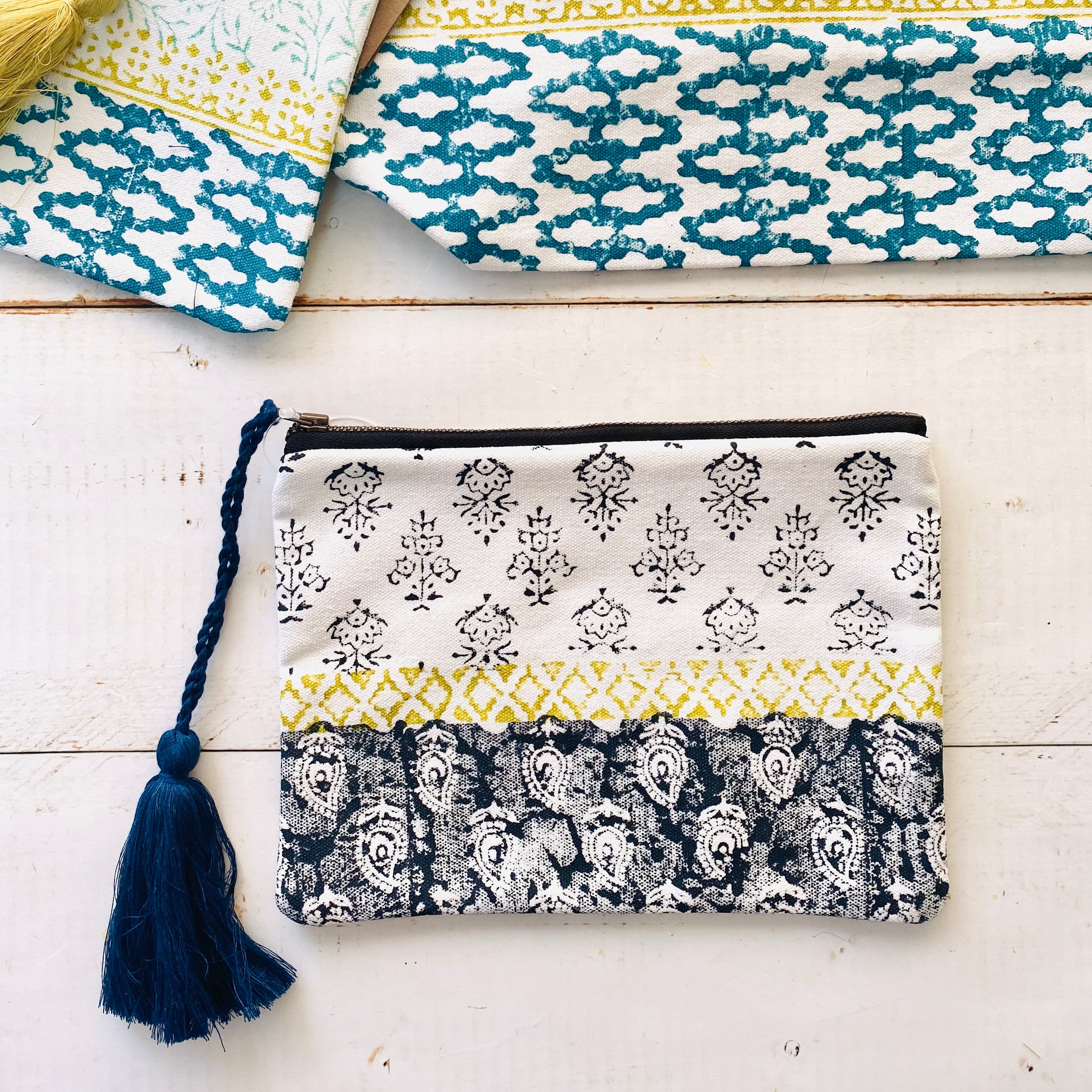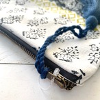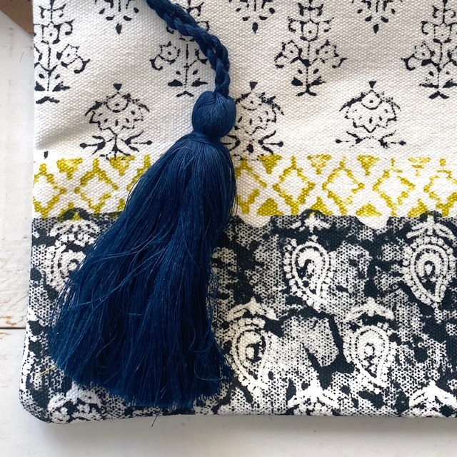 キャンバス地にナチュラルさを感じさせるカラーのブロックプリントが施されたフラットポーチです。 大きめのタッセルがゆらゆらと可愛らしいアクセントになっています。 色違いもご紹介していますのでどうぞご覧くださいませ。 サイズ 約22×16cm 素材 コットン
