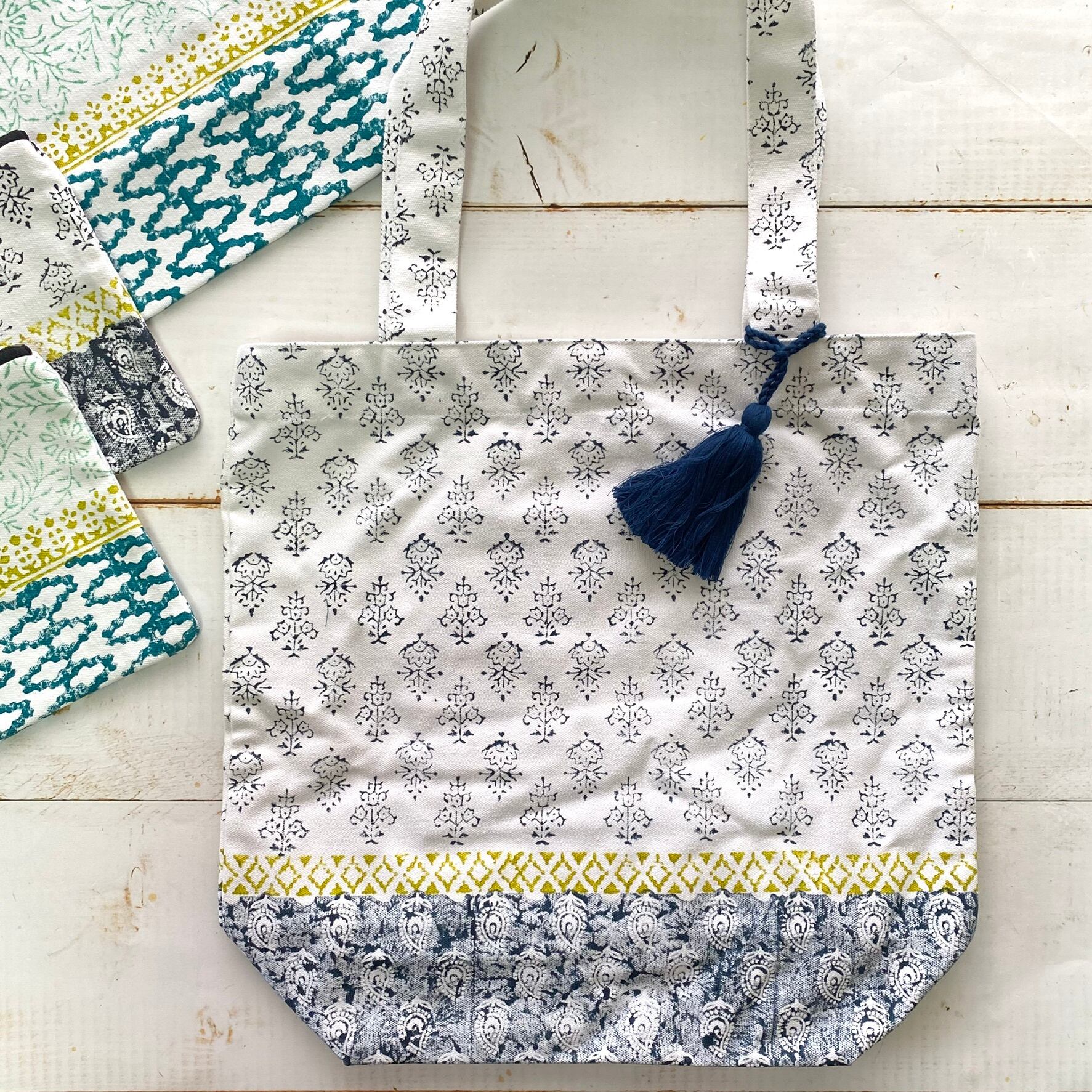 キャンバス地にナチュラルさを感じさせるカラーのブロックプリントが施されたトートバッグです。 大きめのタッセルが可愛らしいアクセントになっています。 お揃いのポーチや色違いもご紹介していますのでどうぞご覧くださいませ。 サイズ 約W37cm×D12cm×H30cm 素材 コットン