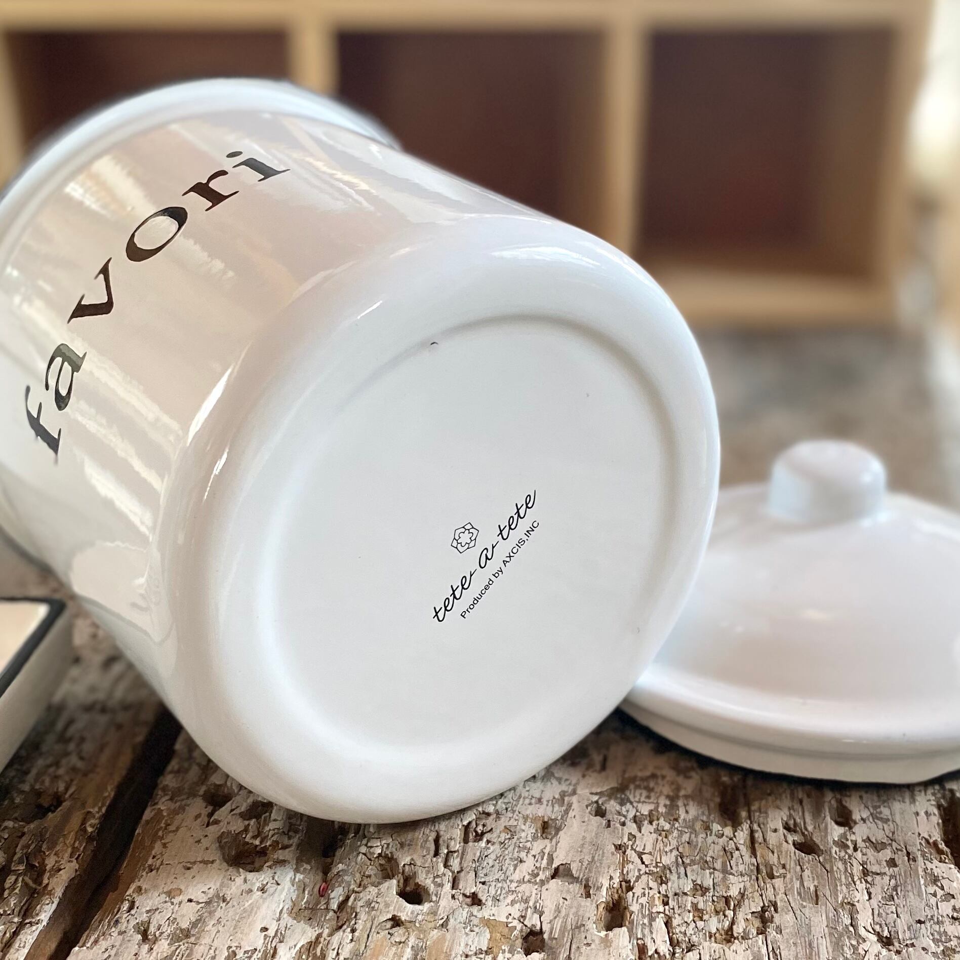 真っ白な琺瑯にfavoriの文字入りのホーローキャニスターです。