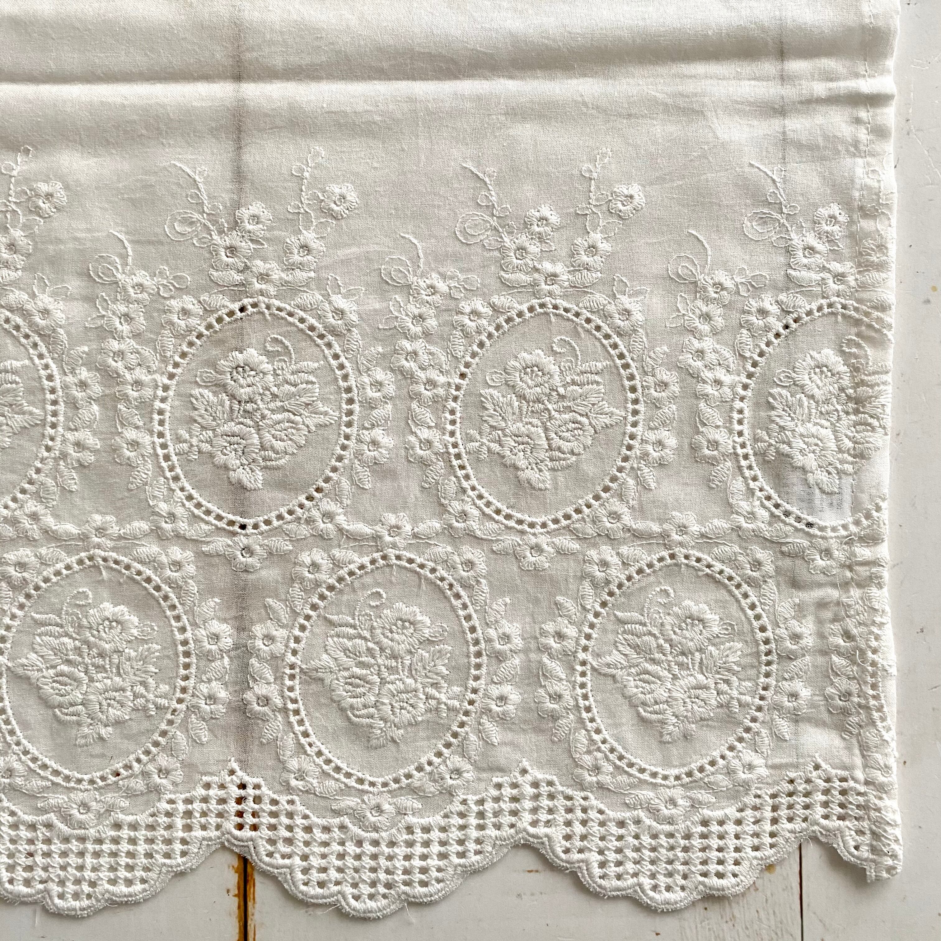 コットン100%の生地にバラの花束の刺繍が施されている優しい雰囲気のカフェカーテンです。 裾のスカラップが素敵です。 サイズ 45×120cm ポール通し部分 高さ約5cm 素材 コットン100%