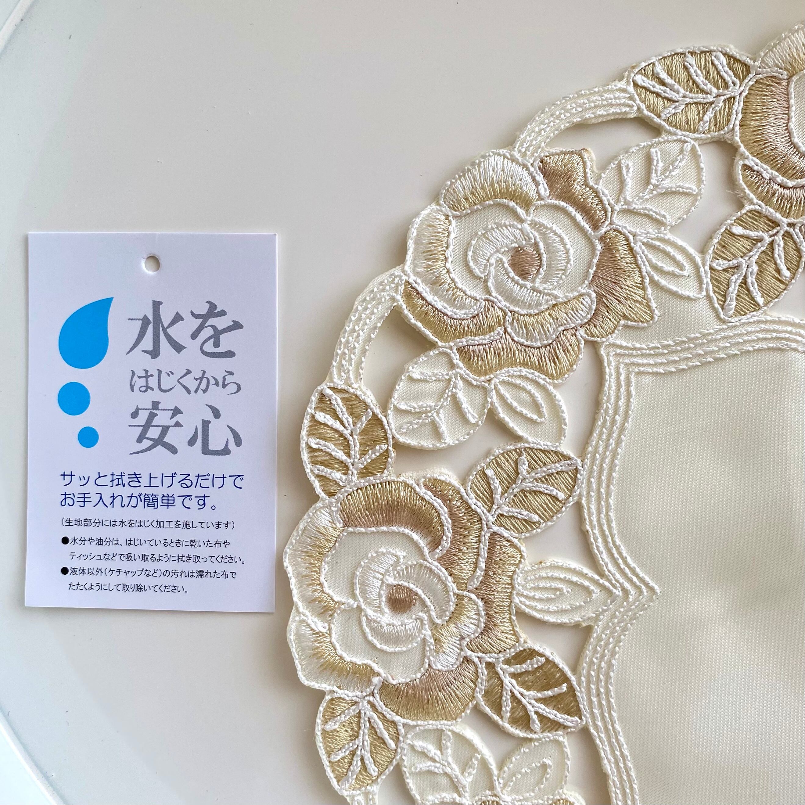 ほんのりとクリーム色がかった無地の生地に同系色でまとめたバラ柄のカラー刺繍が施されたドイリーです。 シャンパンカラーのバラ刺繍明るく優しい色使いで季節を通じてご使用いただけます。 生地には撥水加工が施されています。 ※折り畳んで発送いたします。 サイズ 直径約20cm 素材 ポリエステル100%