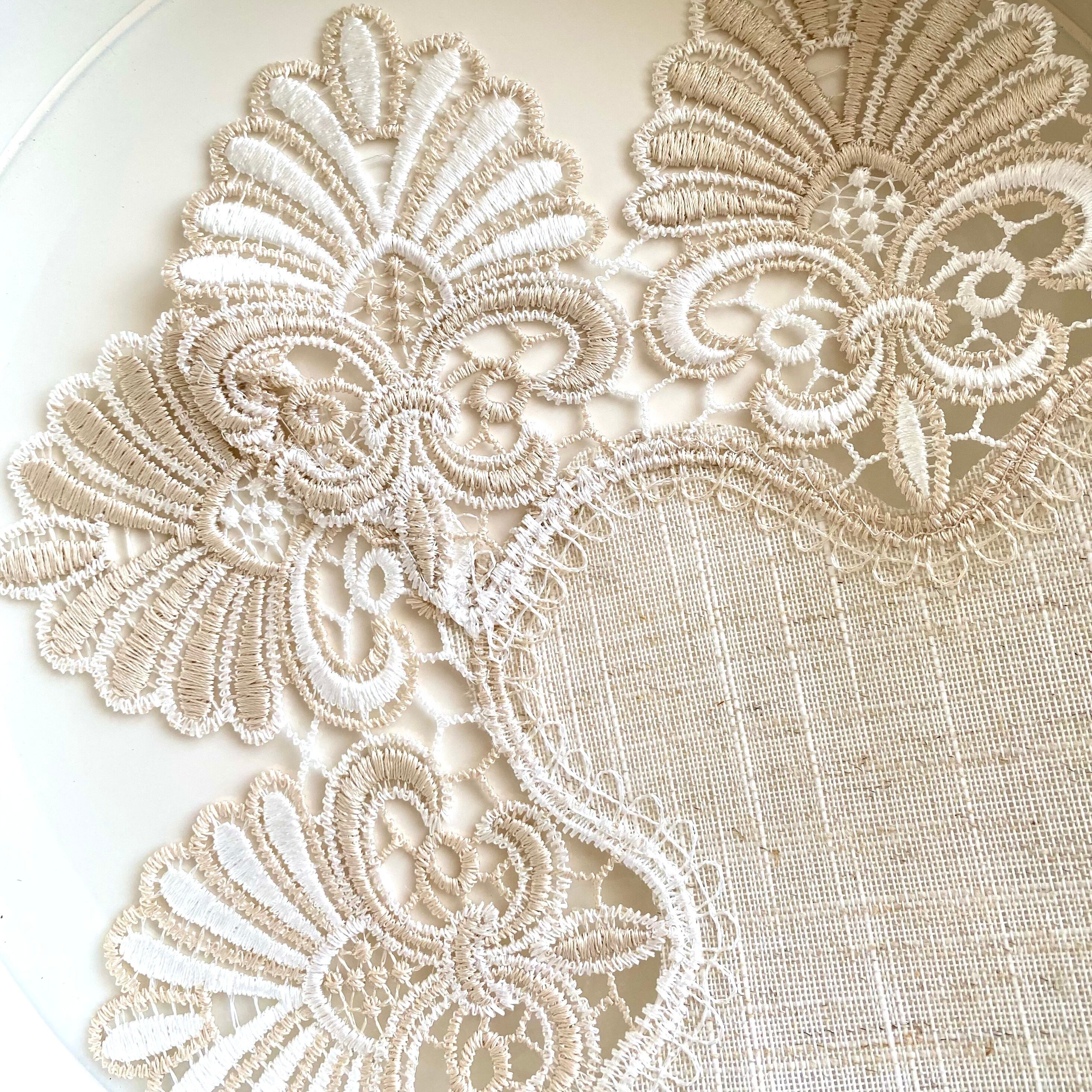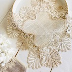 ギュピールレースと麻混生地がマッチして、ナチュラルでどこかなつかしいクラシカルな雰囲気のドイリーです。 お揃いのテーブルクロスも出品していますのでどうぞご覧くださいませ。 ※折り畳んで発送いたします。 サイズ 約30x30cm 素材 生地部分:ポリエステル80% 麻20% レース部分:ポリエステル100%