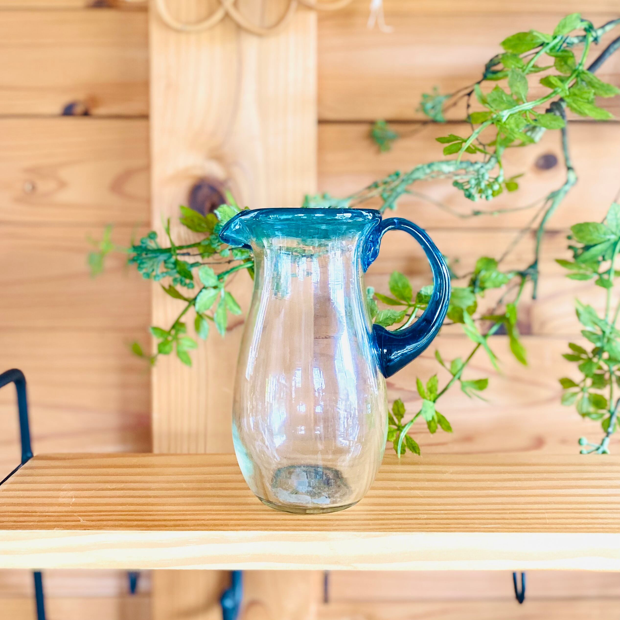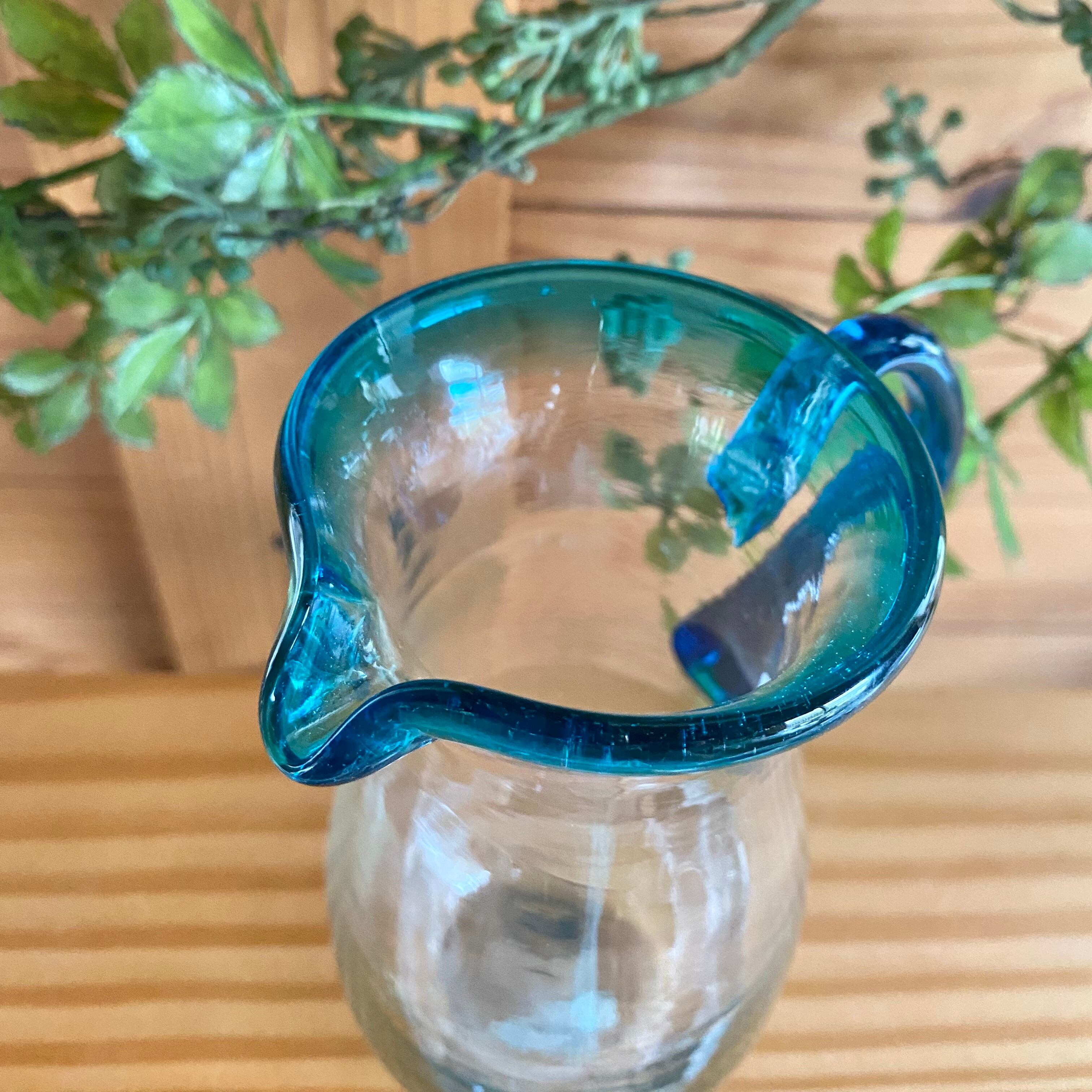 手吹きガラスの一輪挿しです。 ピッチャーの形がとても可愛らしいです。 開口部と取っ手が美しいグリーンで見ているととても癒されます。 手作りならではの肉厚さとリサイクルガラスの素朴な雰囲気を楽しんでくださいね。 サイズ 約D9cm×H13cm 生産地 メキシコ 素材 リサイクルガラス