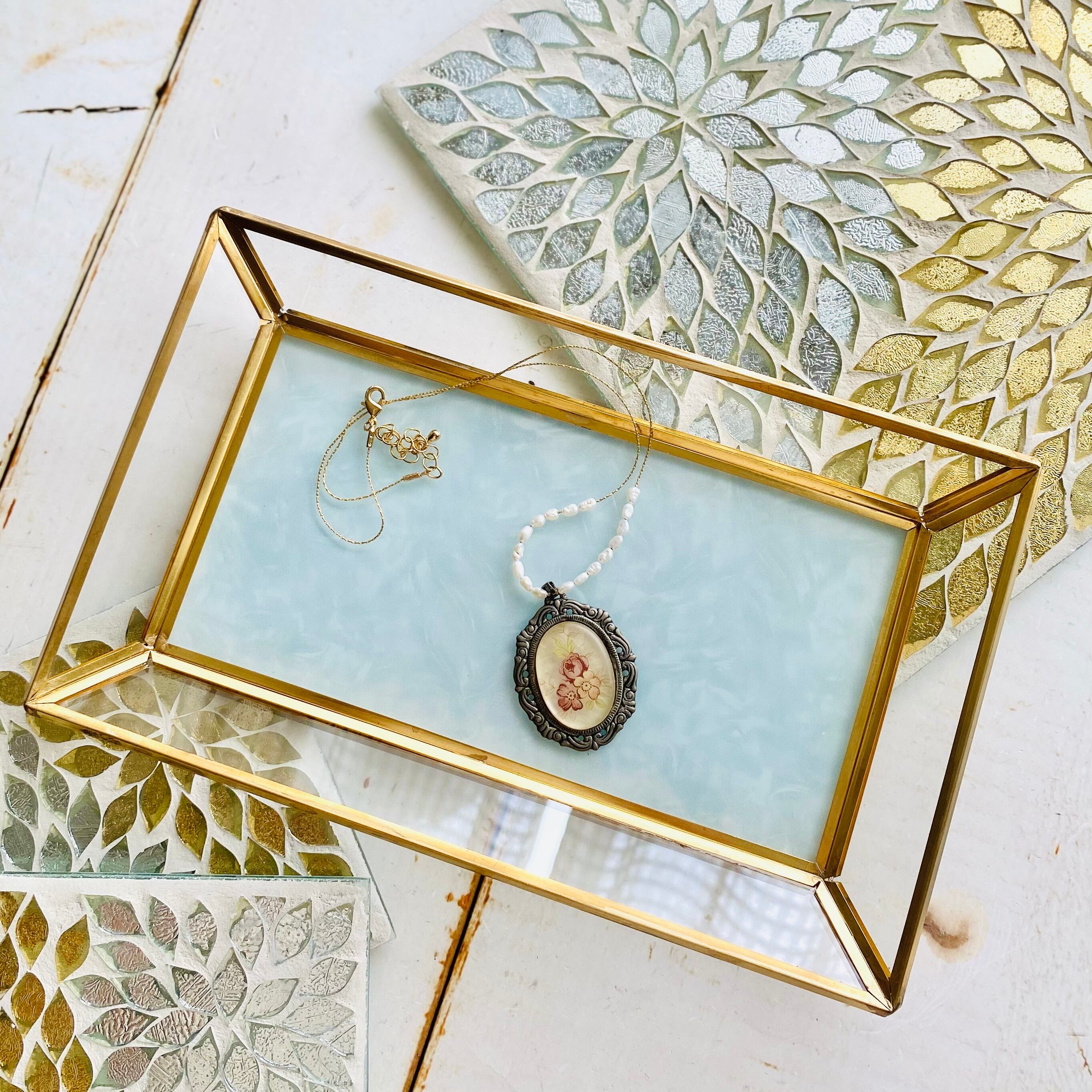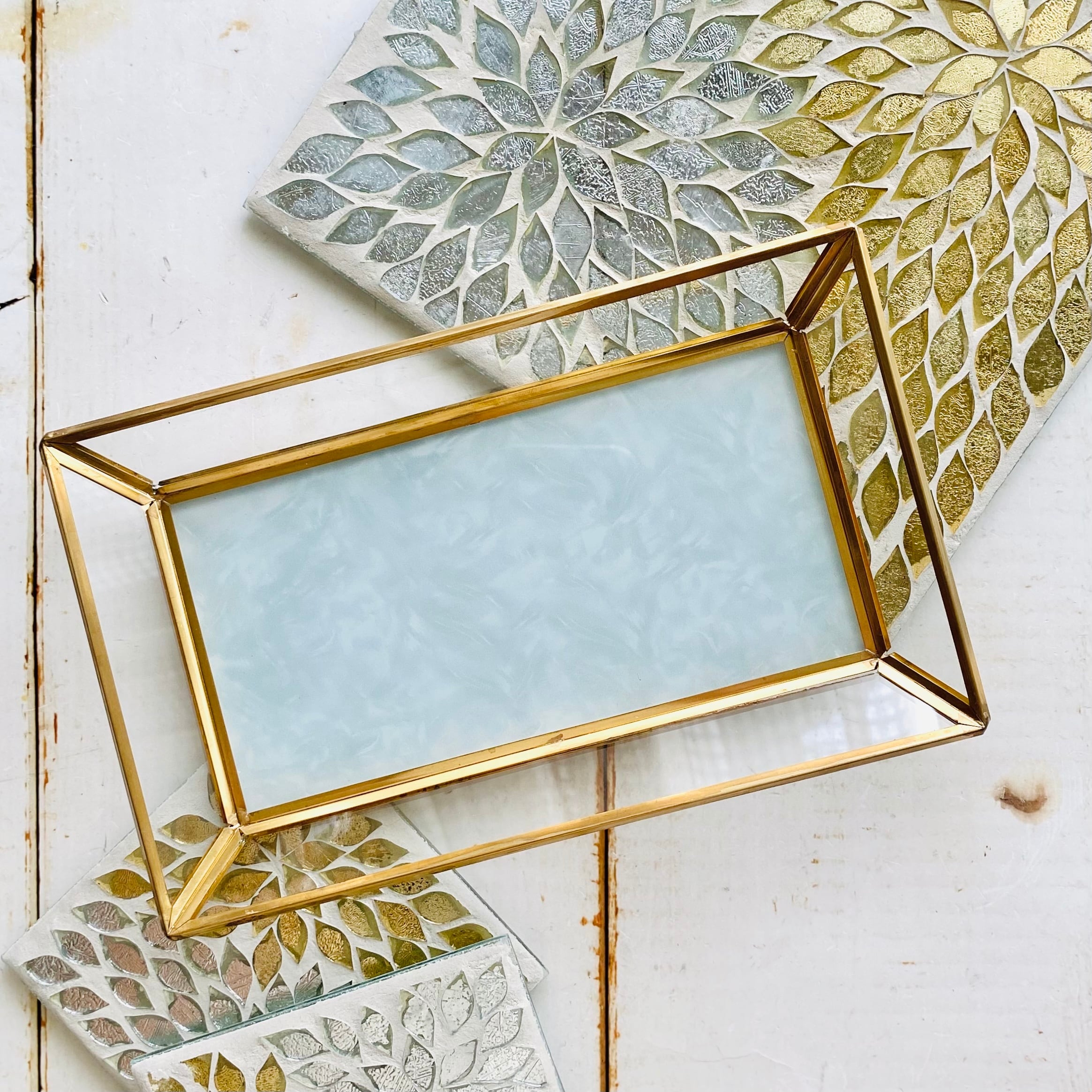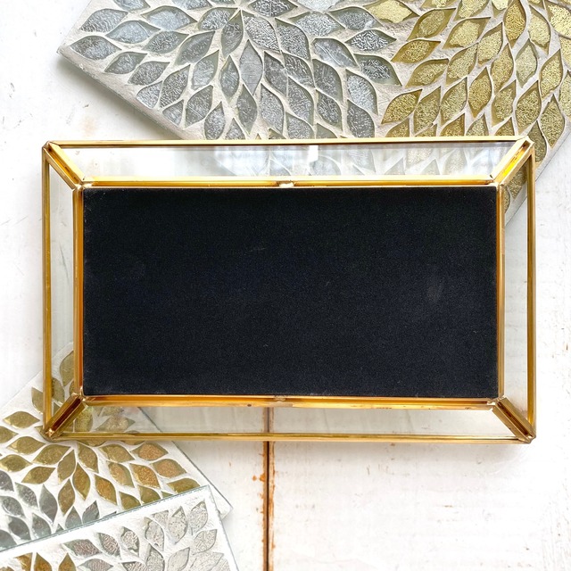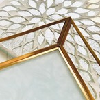 小物やアクセサリーをお洒落に置いて頂けるディスプレイトレイです。 大理石のような柄をガラスにプリントした高級感のあるデザイン です。 裏面の底にはクッション性のあるシートが貼りつけてありますのでテーブルなどを傷つけることはありません。 縁取りの素材は真鍮です。 サイズ 約W21xD13xH2cm 素材 ガラス、真鍮