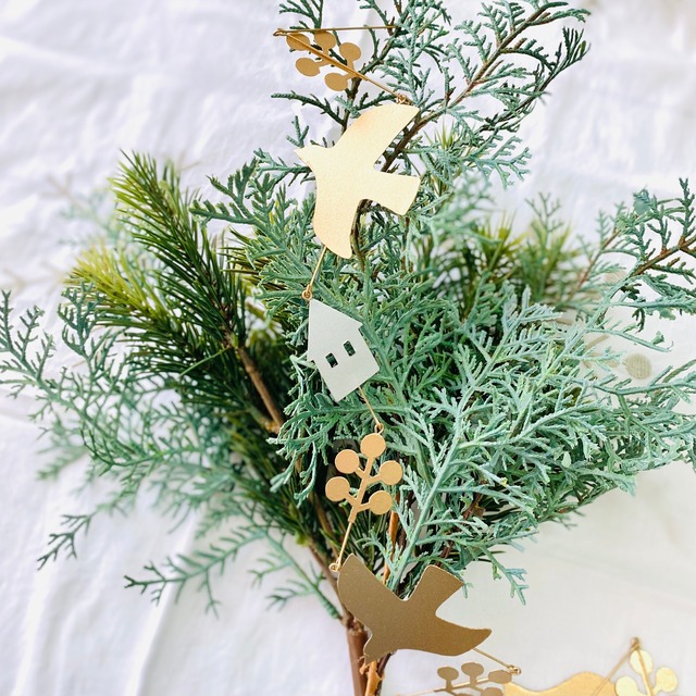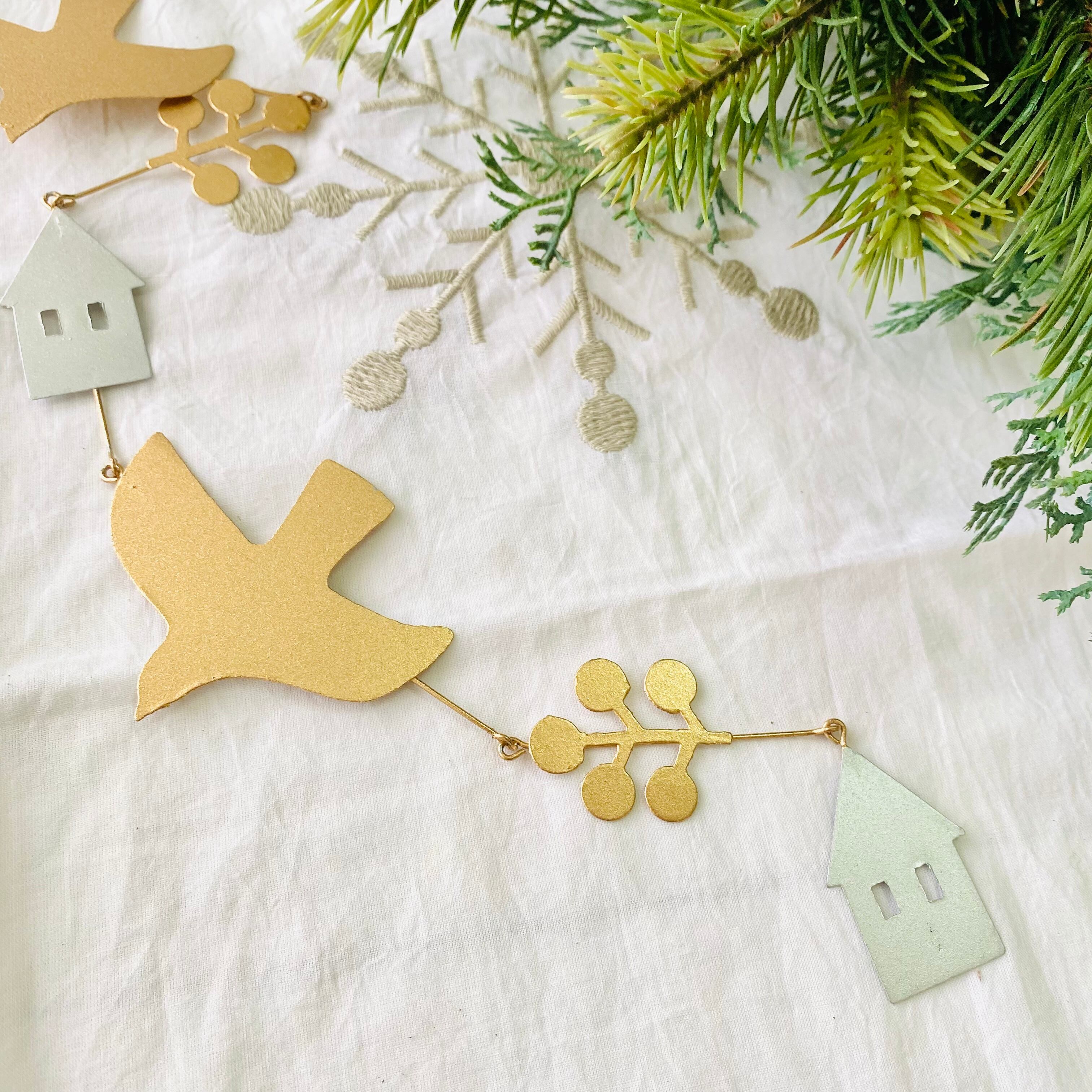北欧の鳥や植物をモチーフにしたガーランドです。 季節を問わずに使えるデザインにしているのでクリスマス以外の時にも飾っていただけます。 リースフックで吊るしたり、壁に掛けたり使い方は様々です。 サイズ 約W5.5×L65cm(フックの長さ7cm) 生産地 フィリピン 素材 TIN