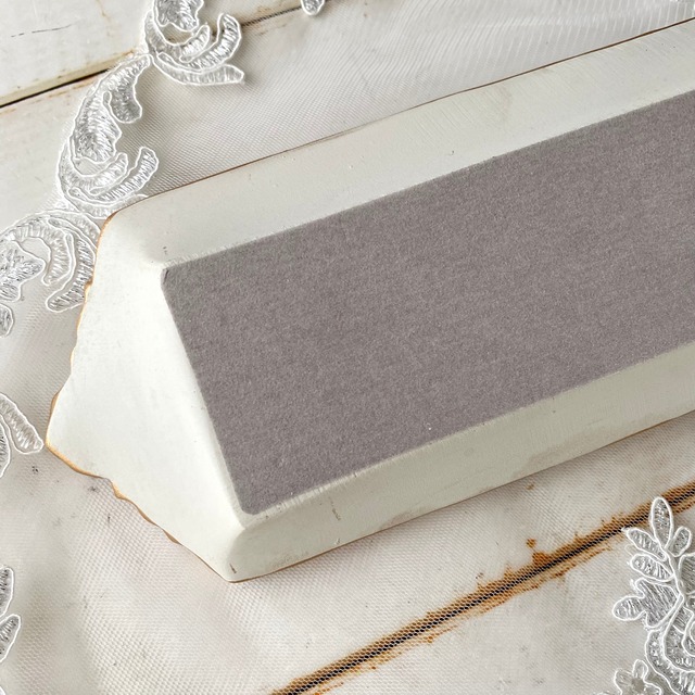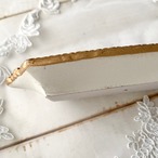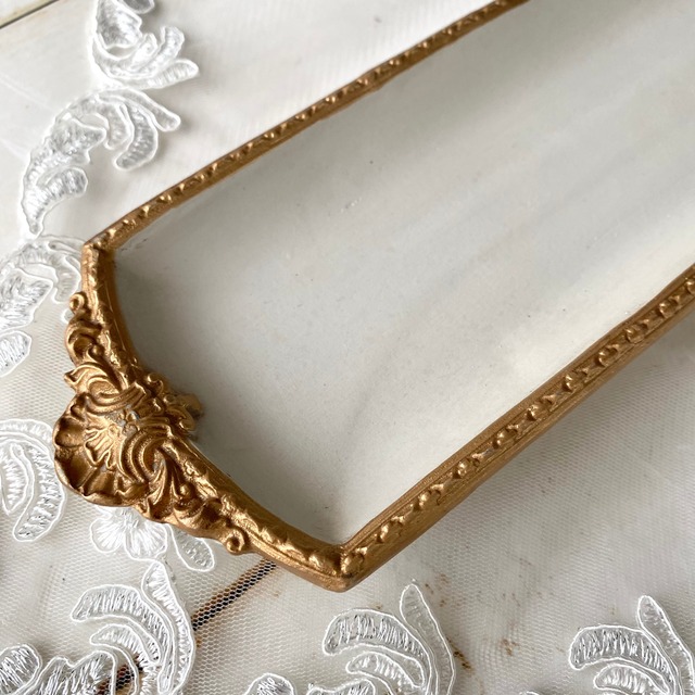 金のようなゴールドの縁取りが美しいアンティークホワイトのトレイです。 アンティーク感を増すためラフな塗装が施されています。 ペントレイやブラシトレイにおすすめの大きさです。 サイズ 約29×8cm 高さ約2cm 素材 レジン