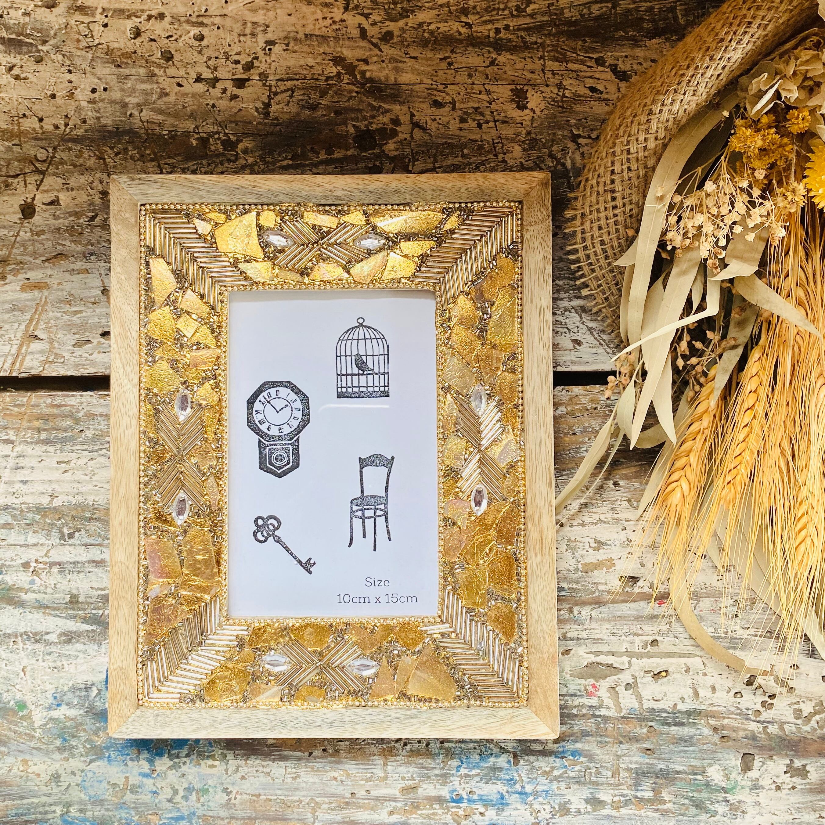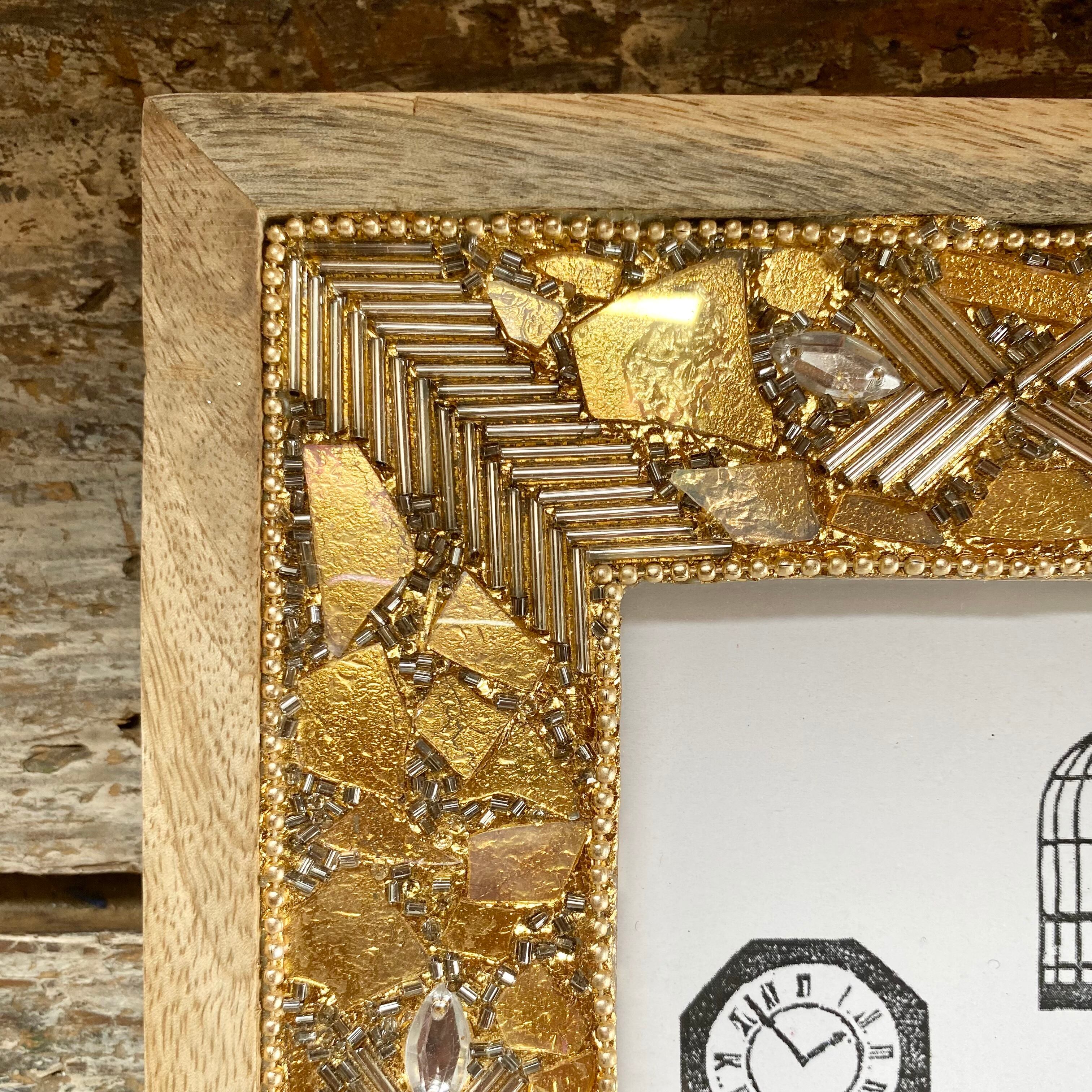 ビーズをたっぷり取り入れたゴージャスでキラキラとしたレクタングルフォトフレームです。 ナチュラルウッドとビーズの組み合わせのバランスがお洒落です。 サイズ 約W19×L24cm 生産地 インド 素材 ウッド、ビーズ、ガラス