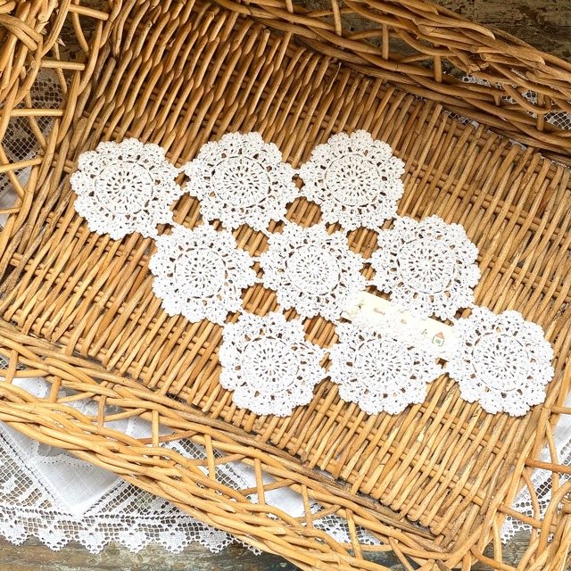 繊細な細糸クロシェ編みレースマットです。 9個のモチーフが繋ぎ合わさった菱形のデザインになっています。 サイズ 約19×29cm 素材 綿100%