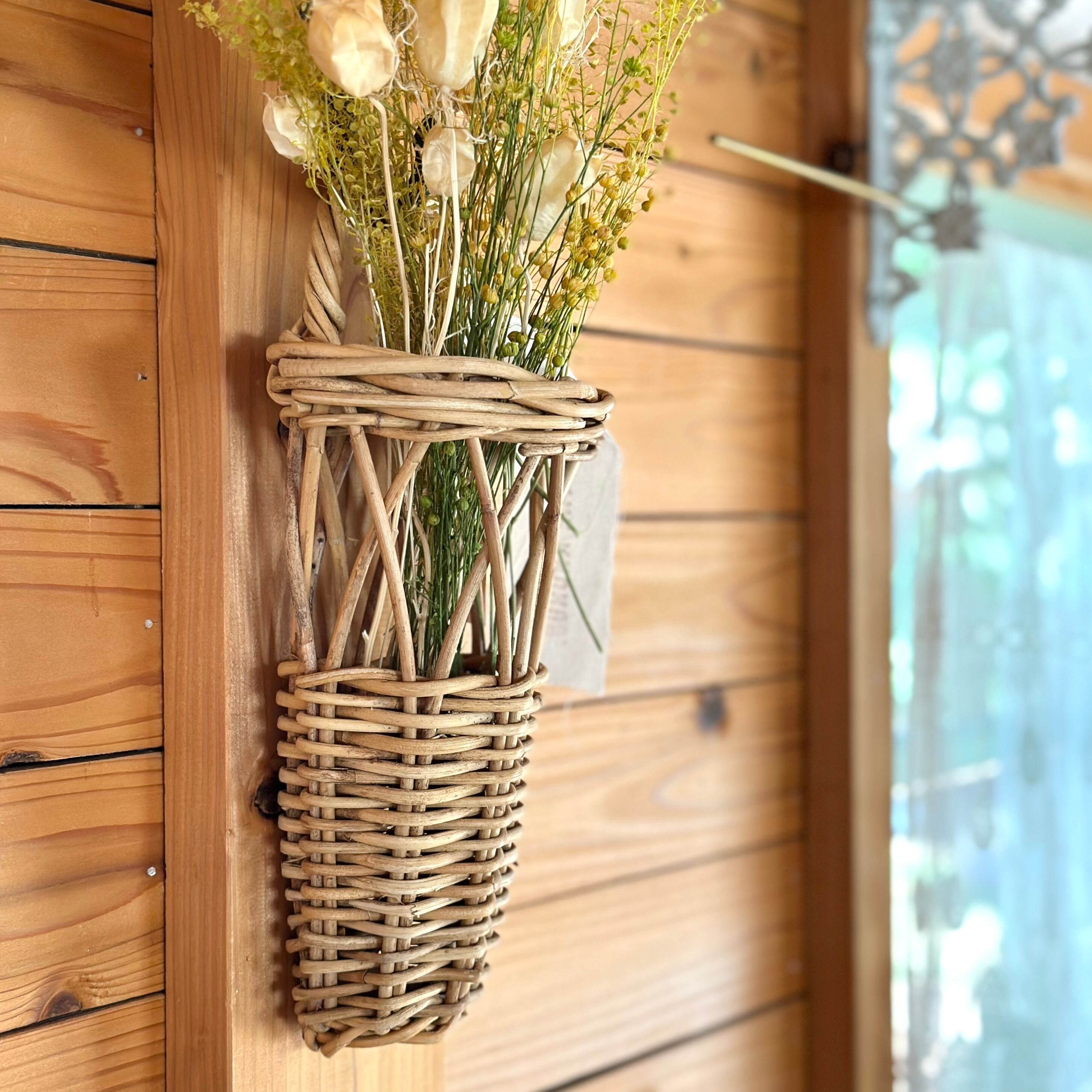 ラタンの風合いが素敵なフラワーバスケットです。 壁に飾るのはもちろん、そのまま立てかけてもお洒落です。 使い込むにつれて色艶が増し、経年の変化もお楽しみ頂けます。 サイズ 約W12×D8×H21cm 素材 皮付きラタン